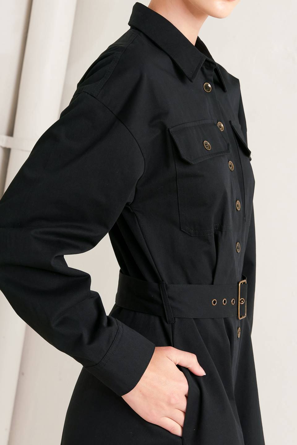 Un vestido midi de tejido liso con cuello camisero, bolsillos, manga larga, botones, cinturón a juego y falda amplia.