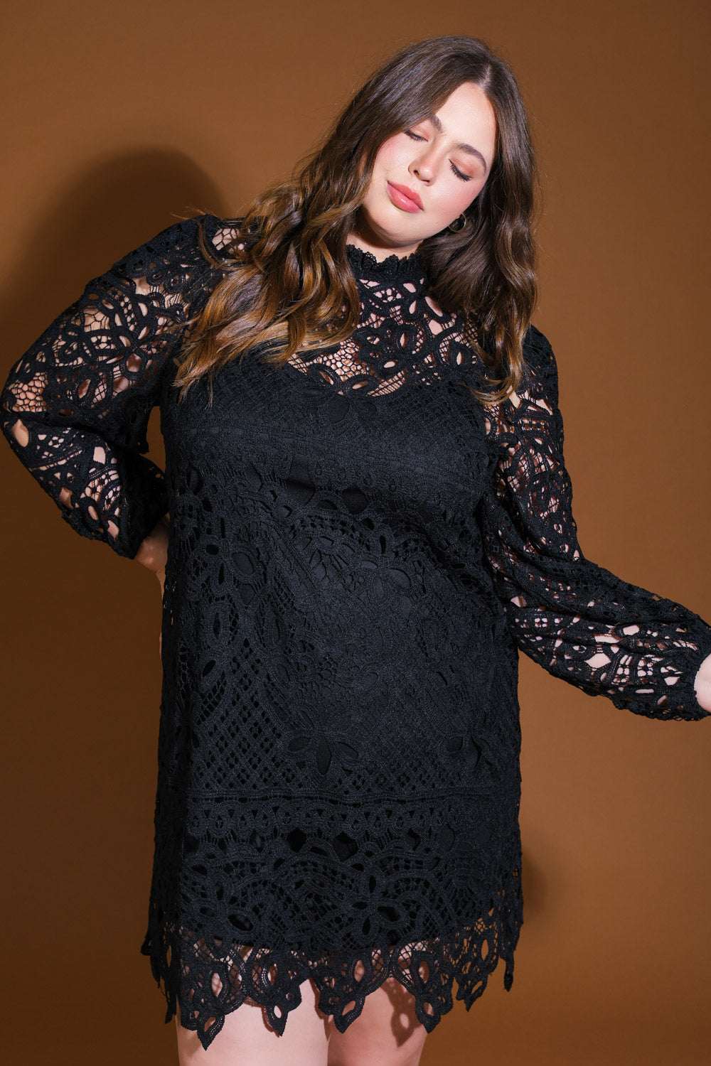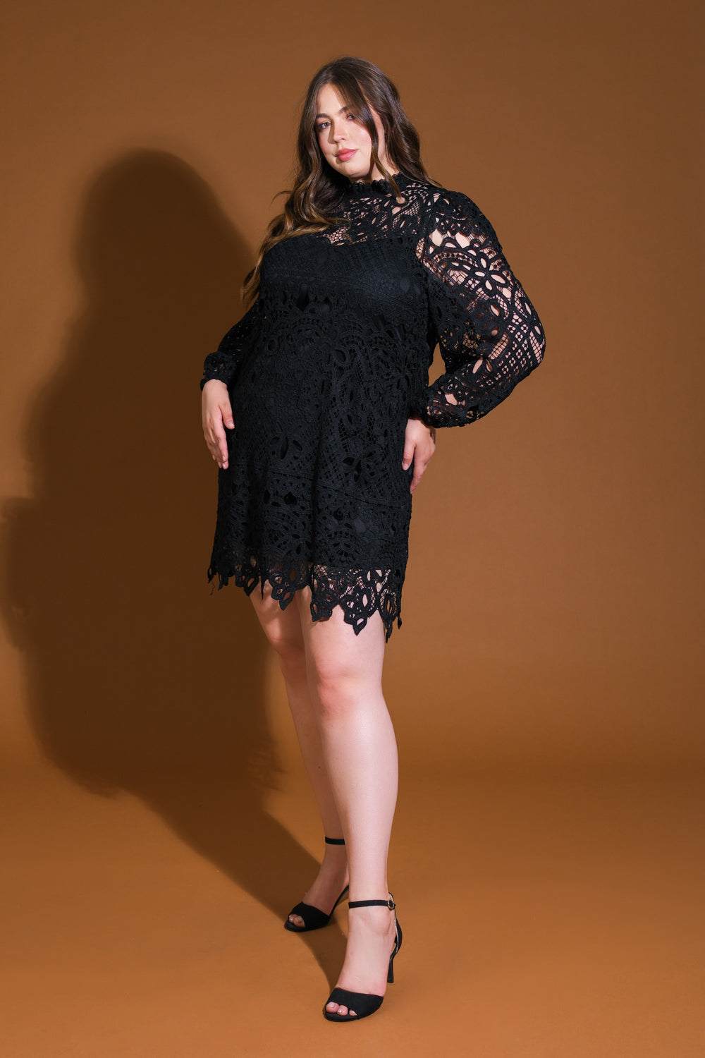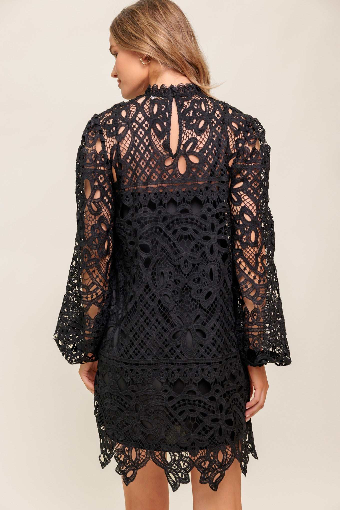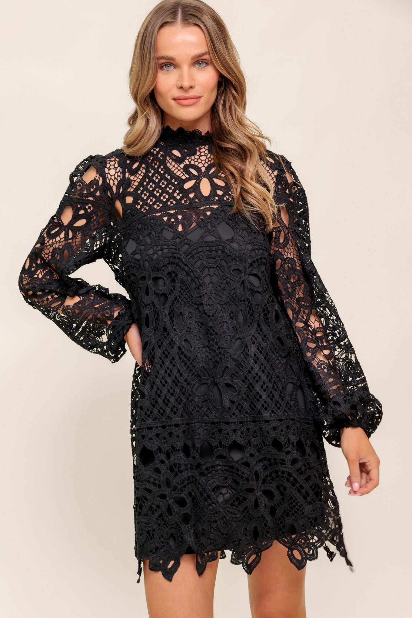 Un minivestido de encaje tejido con cuello alto, manga larga, tirantes finos y cierre de botón en la nuca.