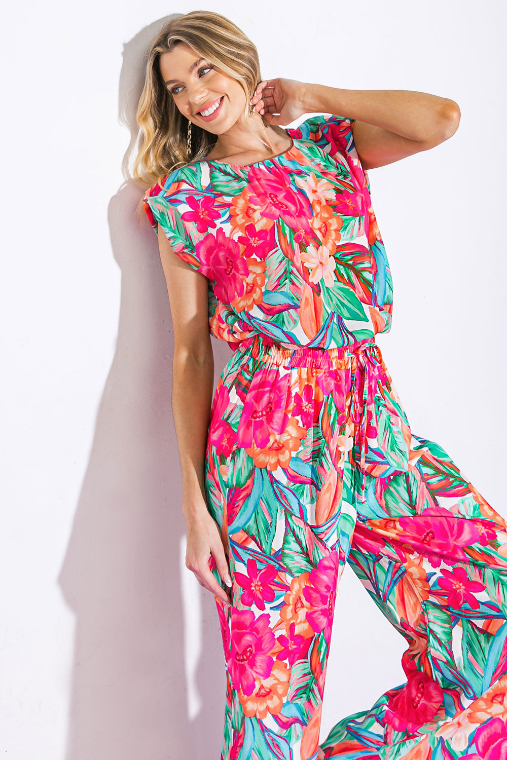 Top estampado de punto con cuello redondo, mangas acampanadas y cierre de botón en la nuca. Pantalón a juego IP8461.