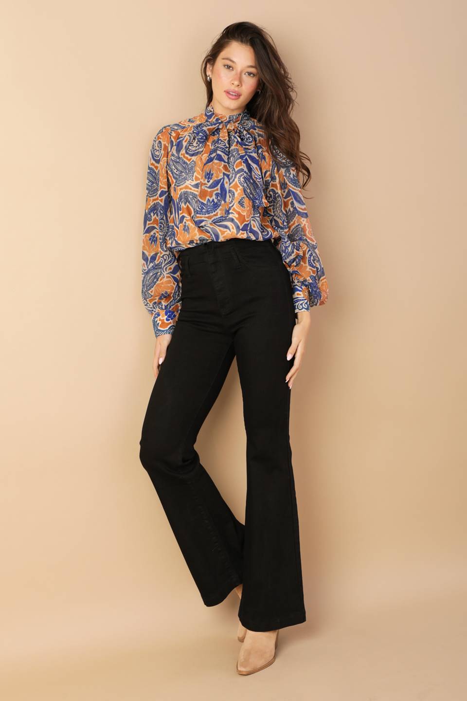 Top tejido estampado con cuello alto, lazo lateral y manga larga.