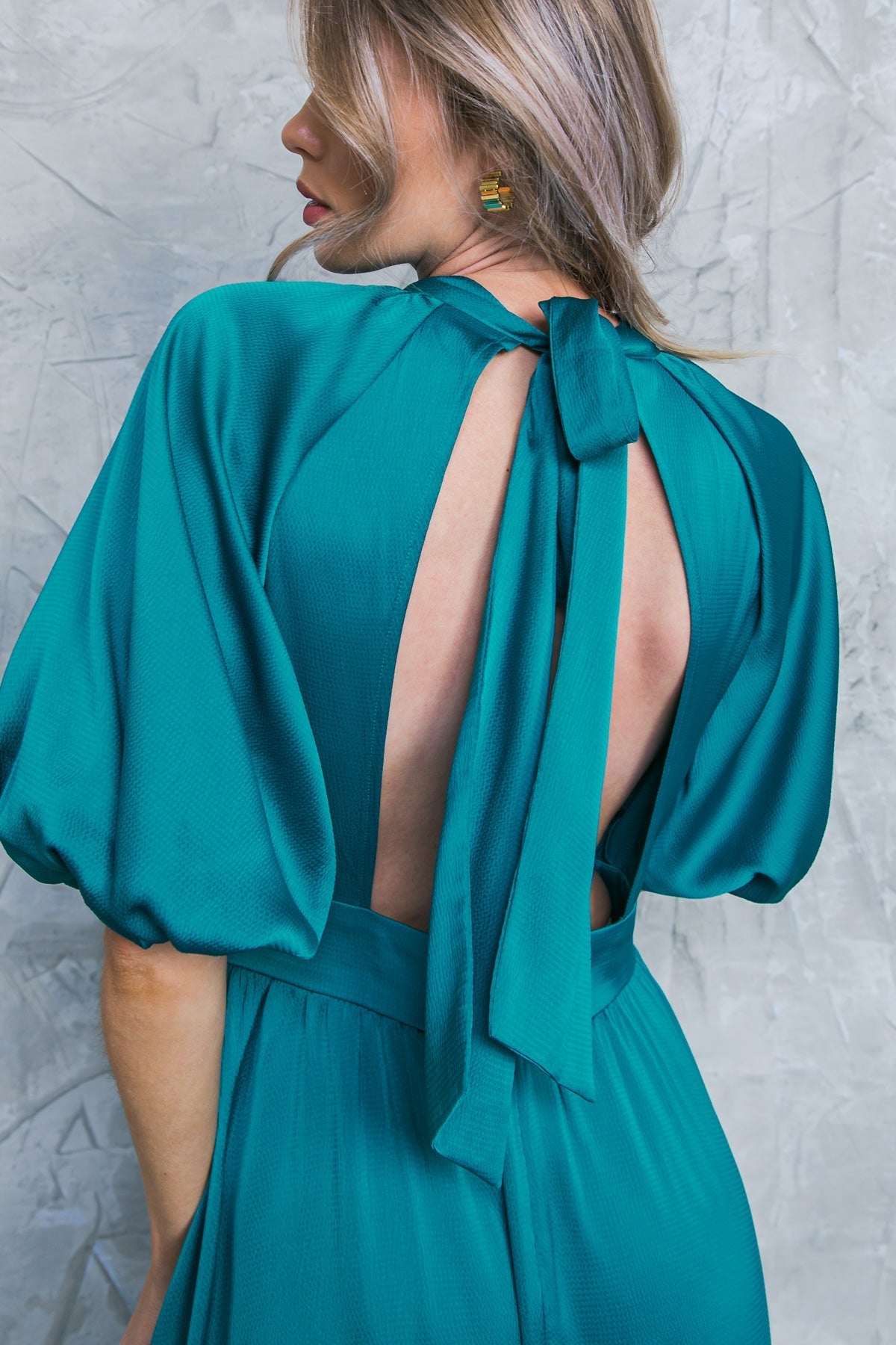 Este sofisticado vestido midi tejido PETAL PROWESS crea una silueta atemporal gracias a su cuello alto, mangas acampanadas al codo y cierre de cremallera. Luce tu espalda con un escote descubierto y un lazo en la nuca. Mantente elegante con el equilibrio perfecto entre estructura y comodidad.