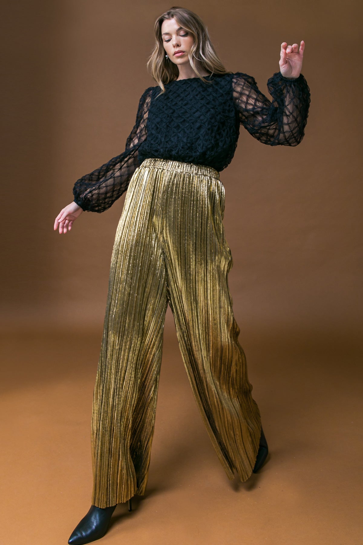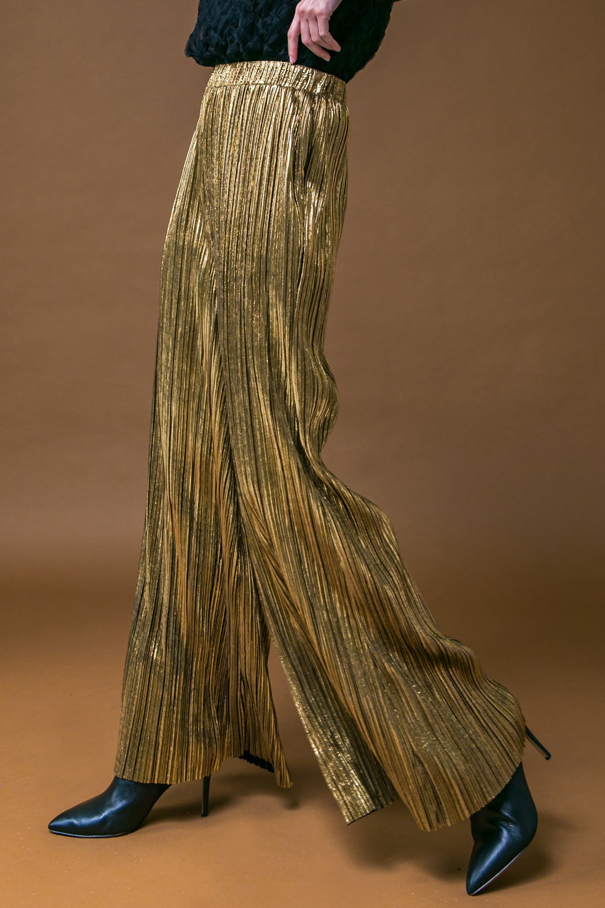 Disfruta de la máxima comodidad con los pantalones tejidos PORCH SWING KISSES. Estos pantalones de pierna ancha presentan un exclusivo diseño plisado que crea una silueta favorecedora. La cintura elástica garantiza un ajuste seguro para usarlos todo el día. Transforma cualquier atuendo con este clásico atemporal.