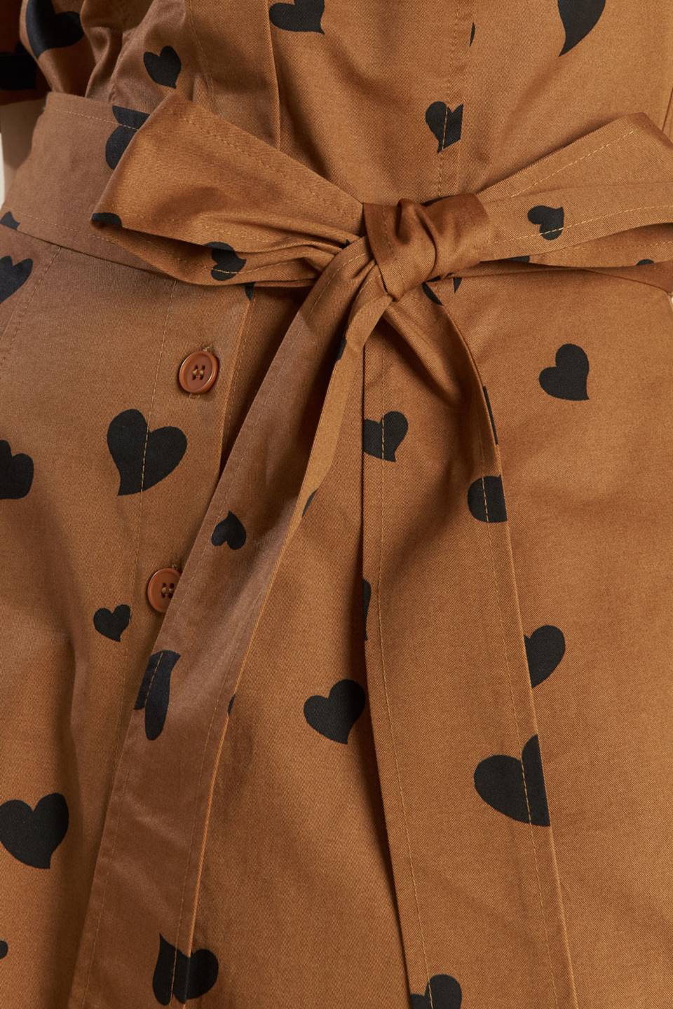 Un vestido midi estampado de tejido plano con cuello camisero, botones, manga corta, lazo a juego, bolsillos laterales y falda amplia.