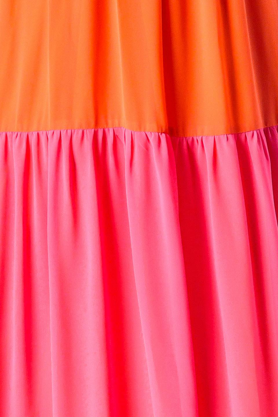 Un vestido largo de tejido liso con bloques de color, top camisero con tirantes, cintura fruncida con detalle metálico central, falda escalonada y cintura trasera elástica.