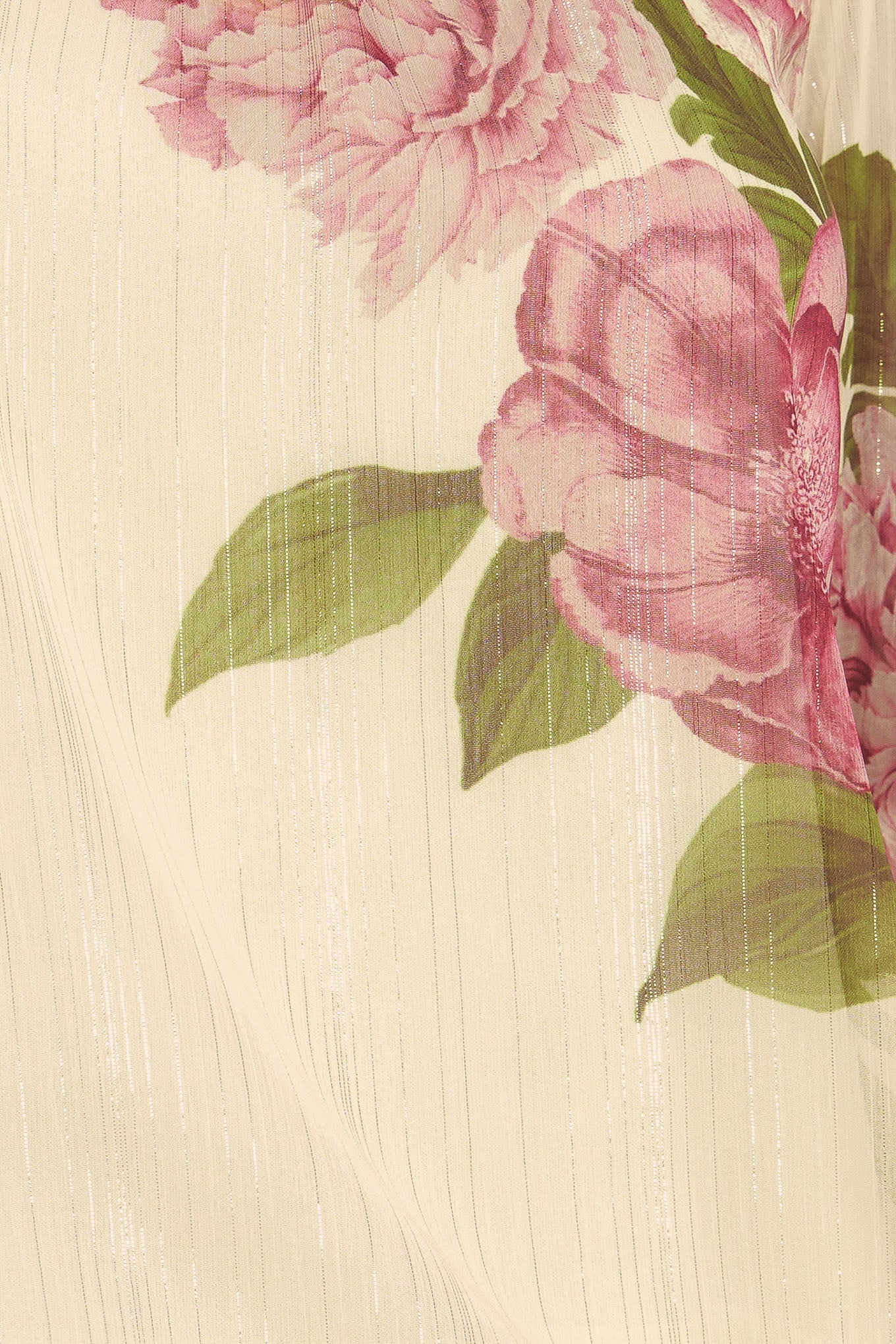 Top tejido estampado con cuello alto con volantes, manga larga con puño fruncido, cierre de botón en la nuca y tirantes.