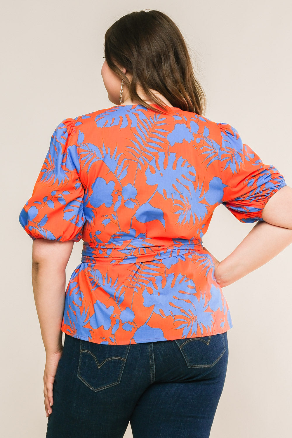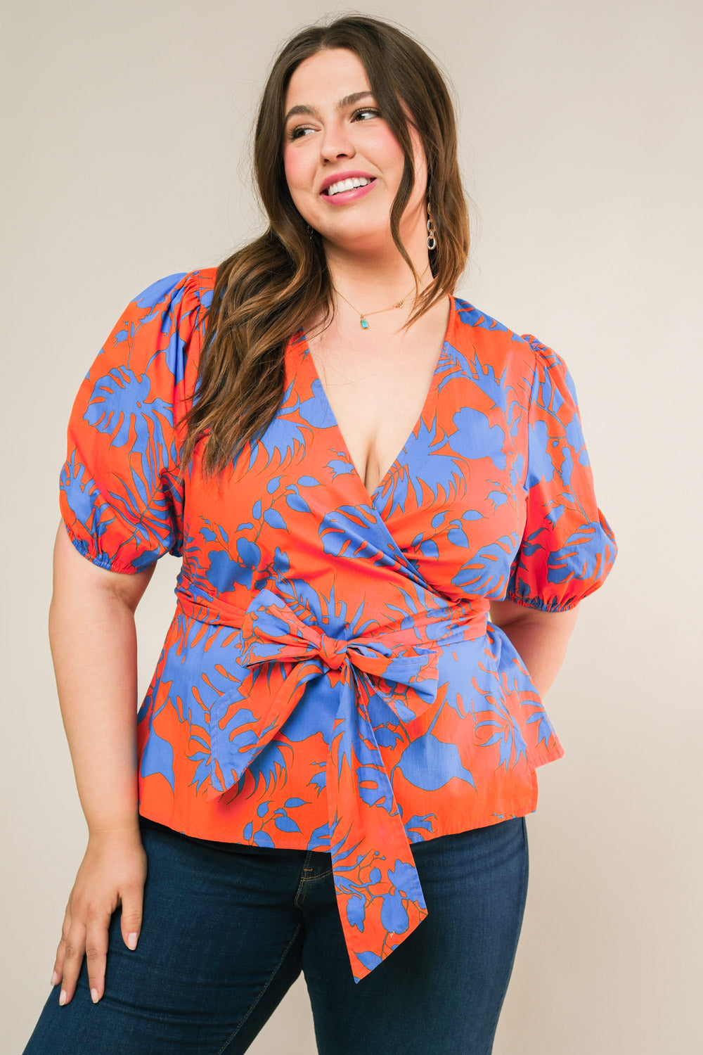 Top tejido estampado con manga corta y diseño cruzado con lazos.