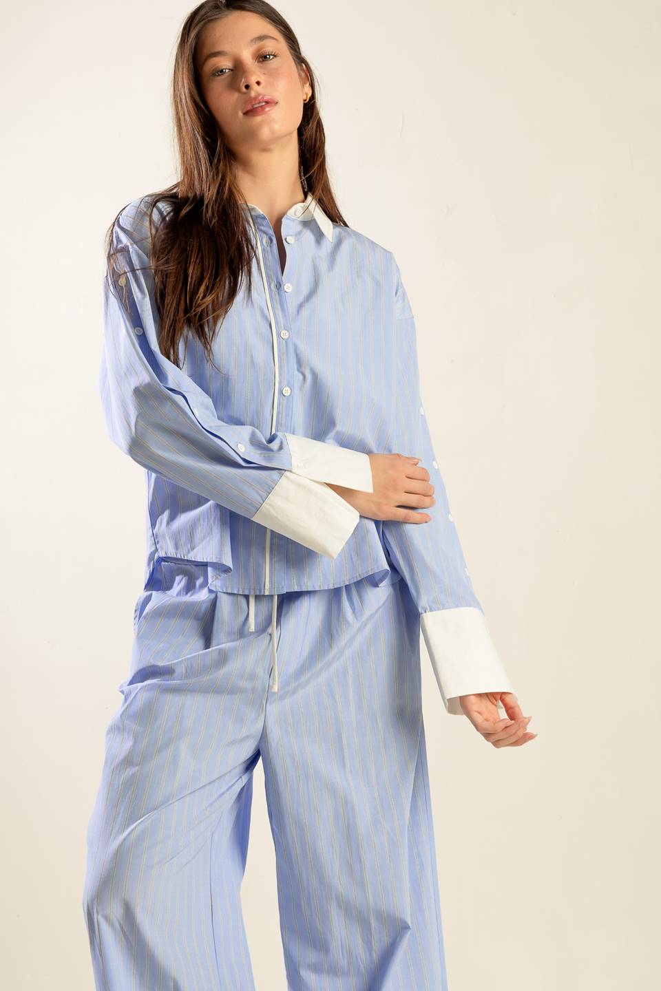 Top de manga larga tejido con cuello y puños en contraste y cierre de botones.