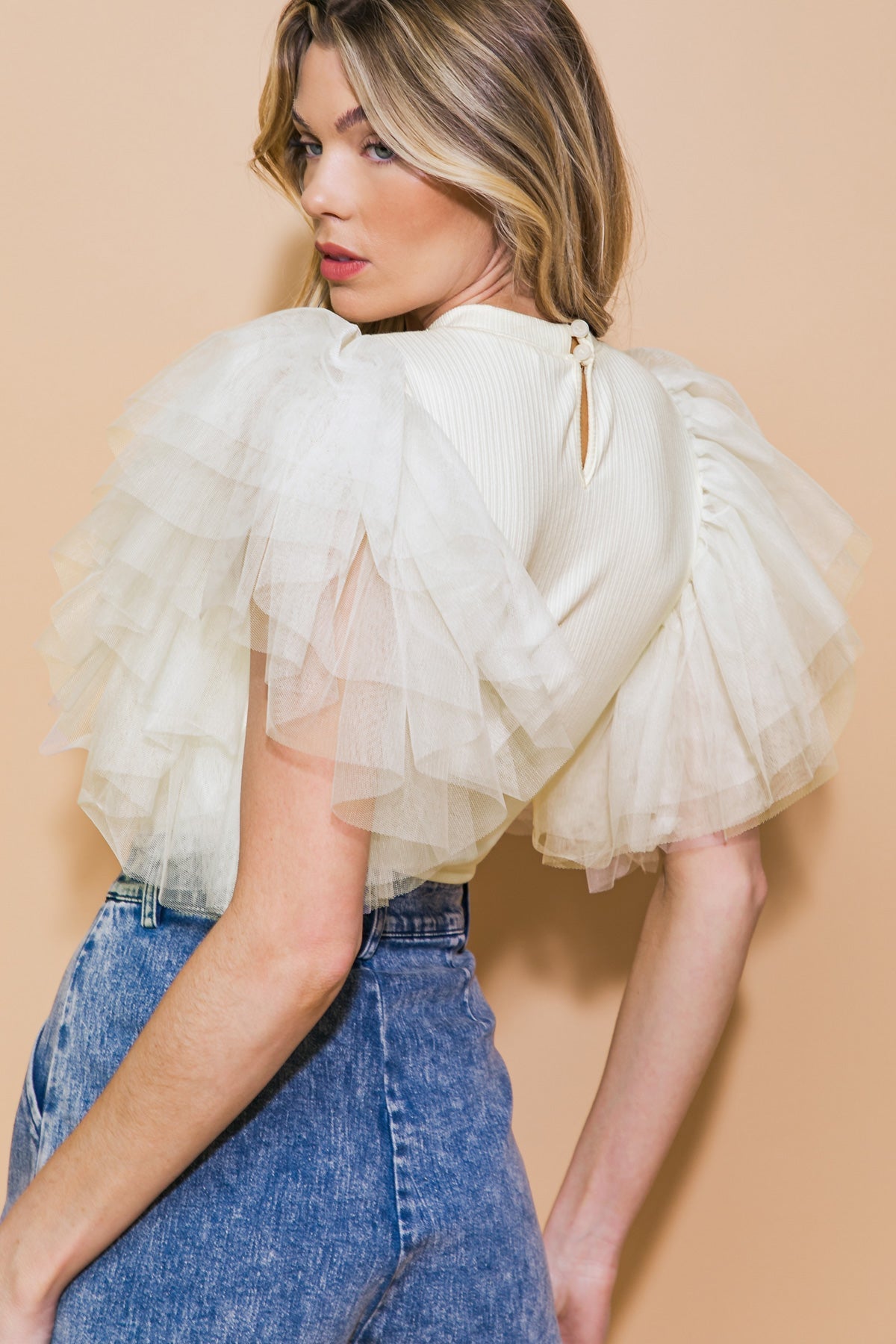 Body de punto acanalado con cuello redondo, ribete de pedrería en el cuello, manga con capa de malla en contraste y cierre de broche en la parte inferior.