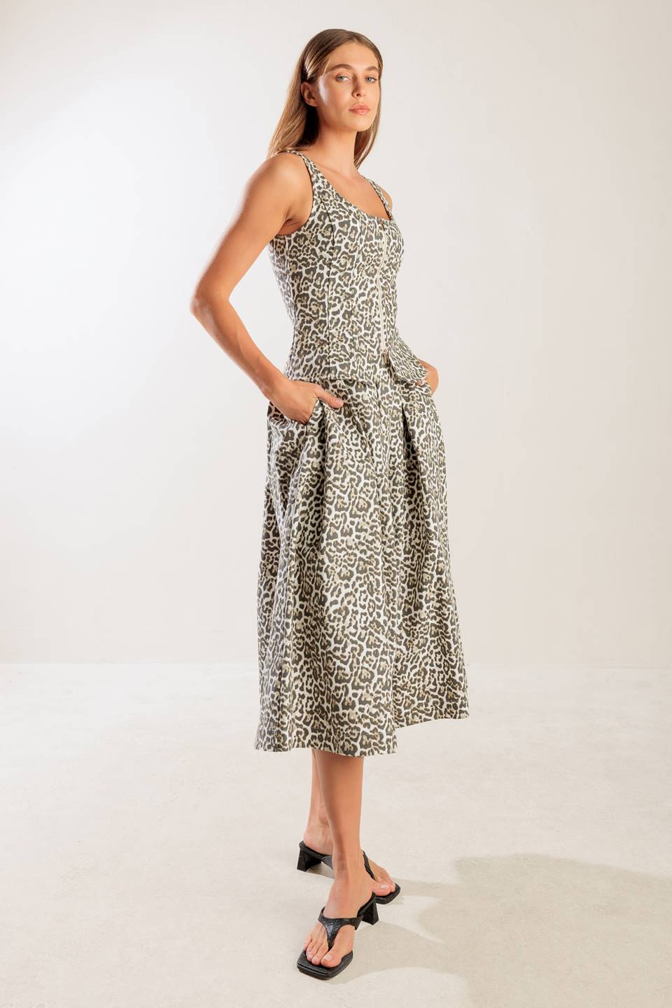 Chaleco tejido con estampado de leopardo, escote en U, sin mangas y cierre frontal con cremallera.