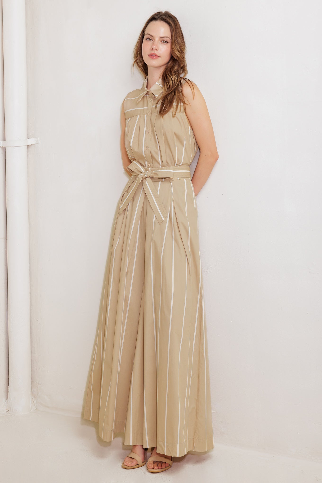 Top de punto a rayas con cuello, sin mangas, abotonado y con pliegues en la parte delantera y trasera.
