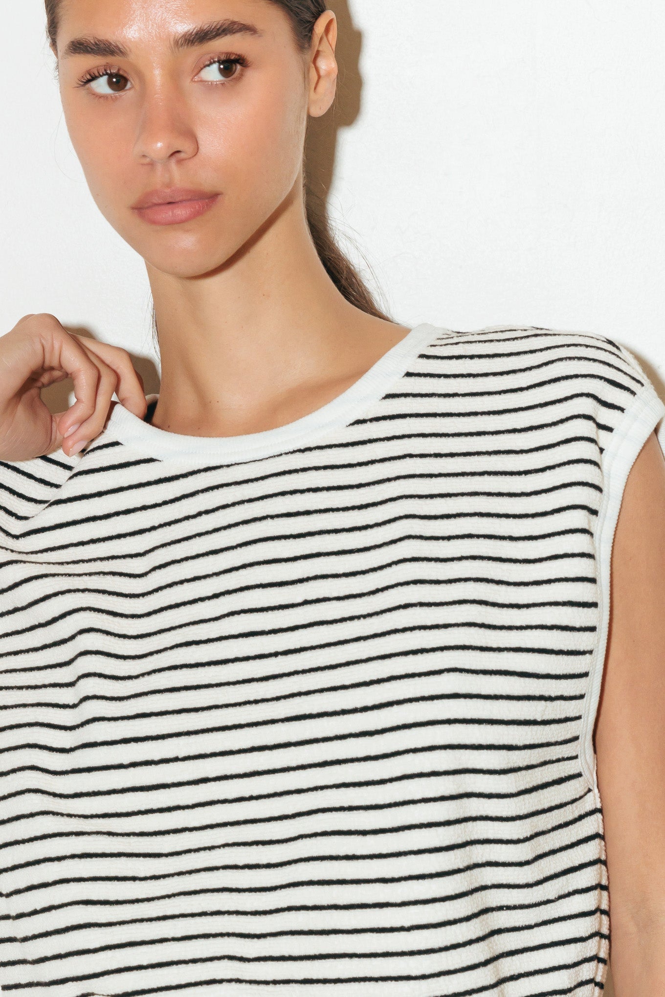 Mono corto de punto a rayas con cuello redondo, sin mangas, cintura ajustable con cordón, bolsillo lateral y espalda cruzada con cierre de botón.