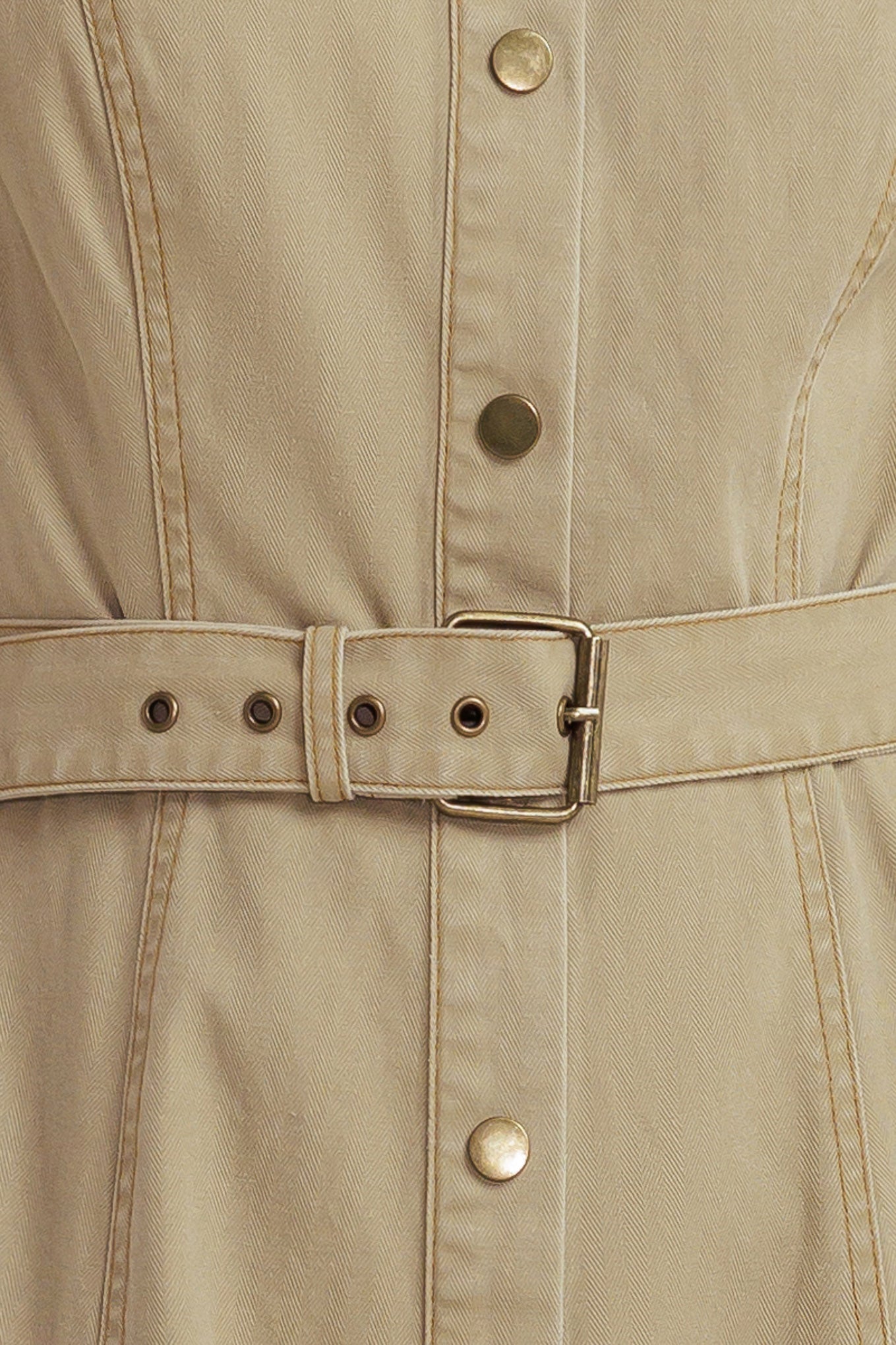 Un vestido midi de tejido liso con cuello, manga corta, botones, cinturón a juego y falda circular.