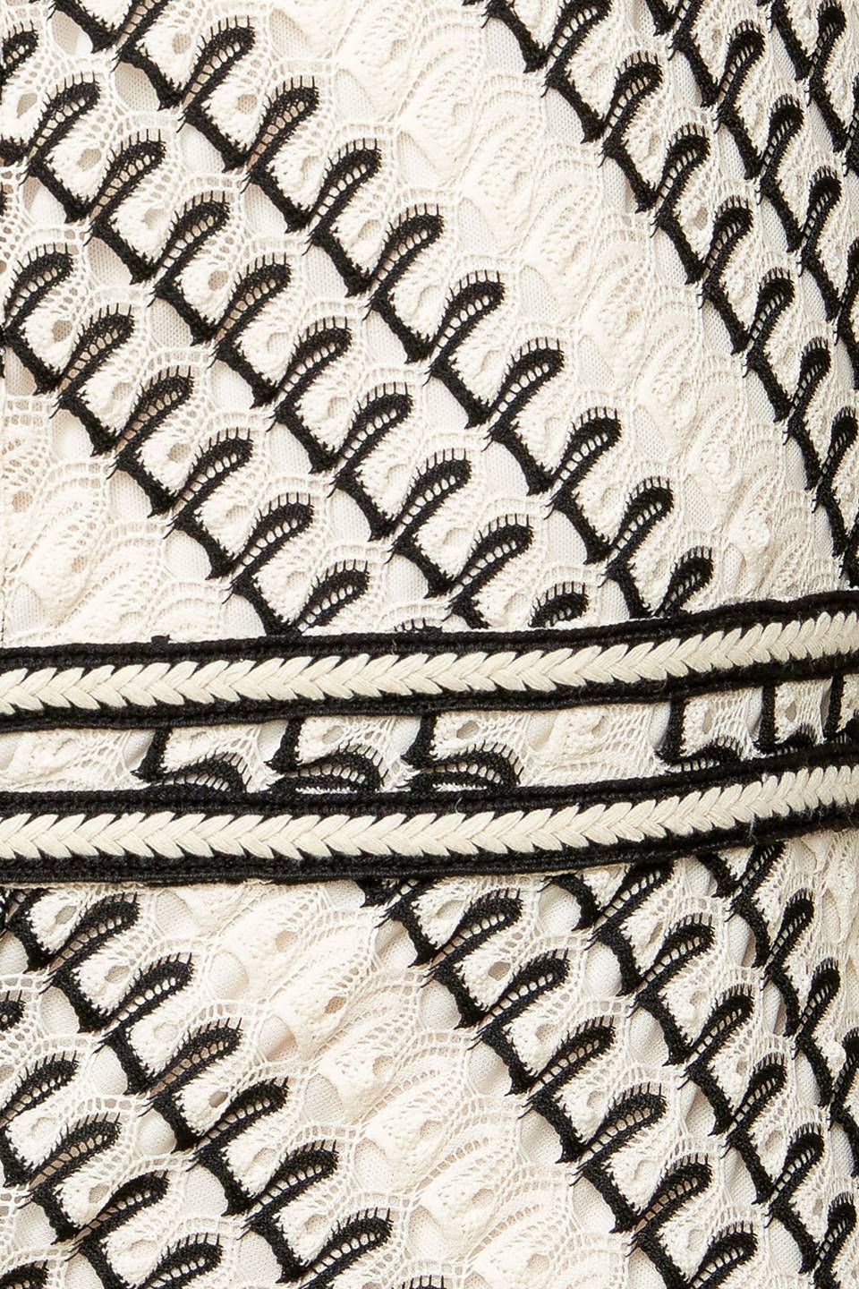 Vestido midi de ganchillo en blanco y negro con cuello redondo, sin mangas, falda de línea A y cierre de cremallera en la espalda.