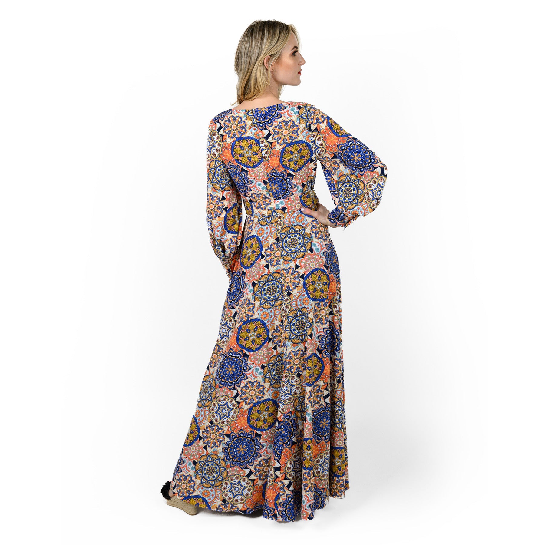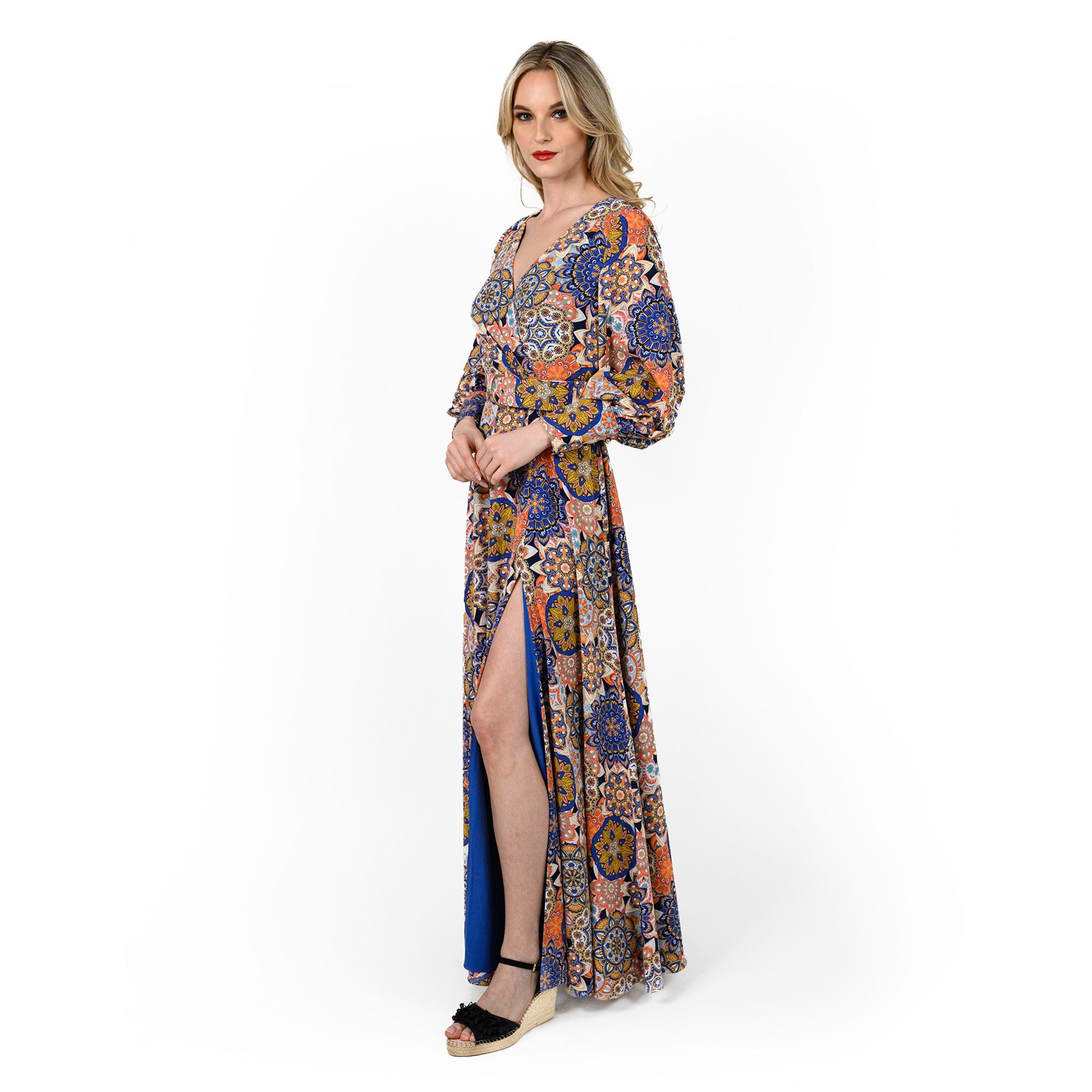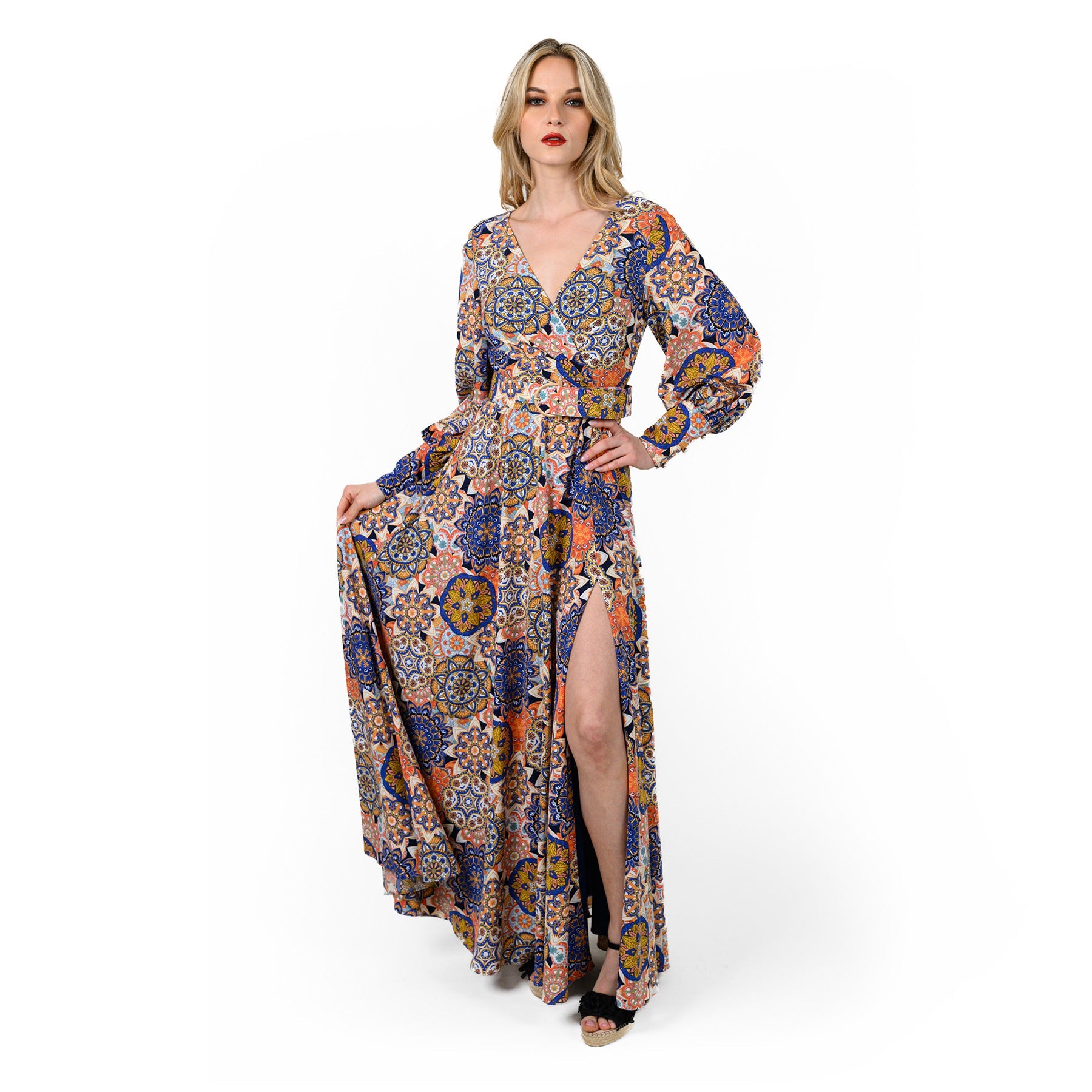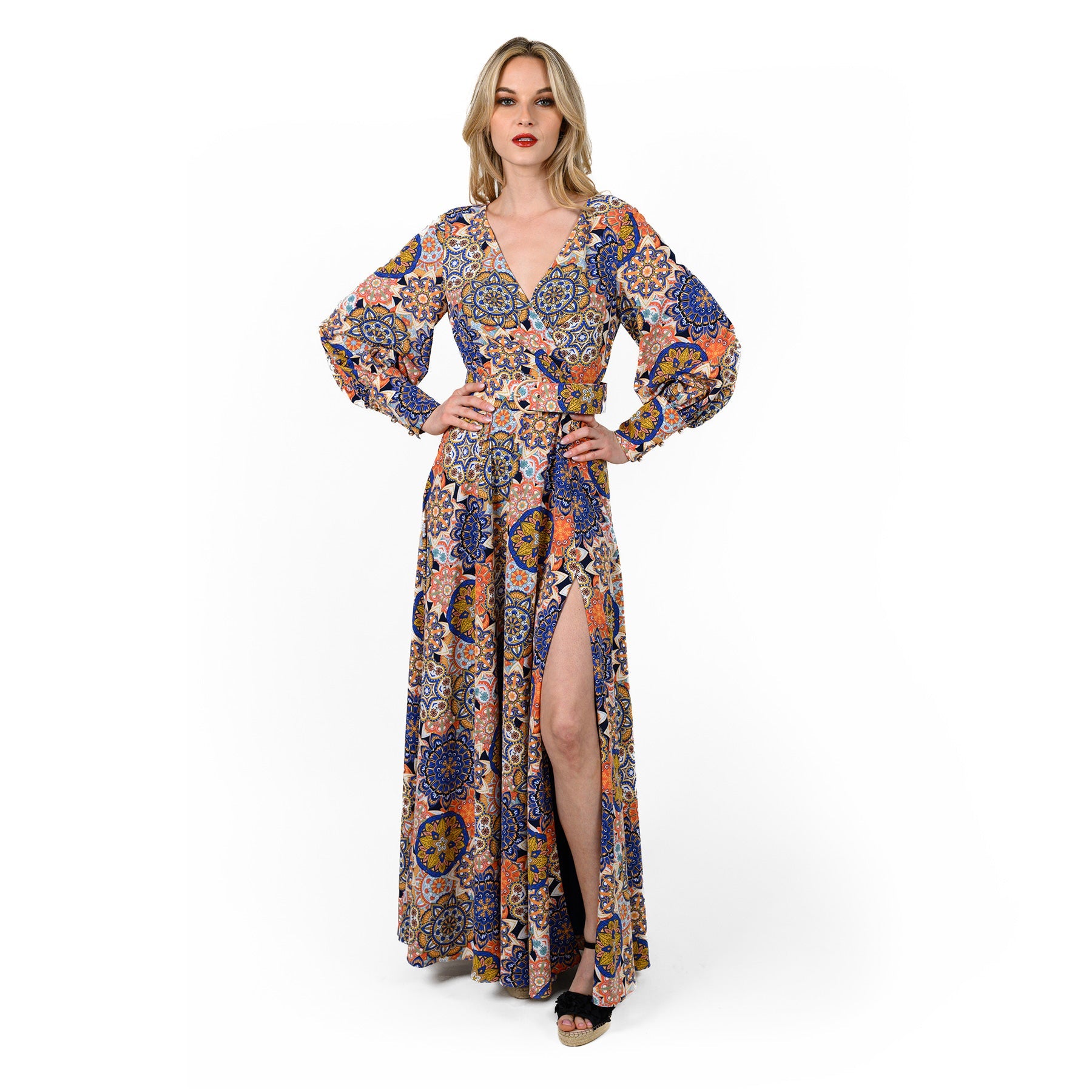Déjate seducir por los estampados florales esta temporada con este vestido de tela estampada y diseño estructurado. ¡Te encantará! Combínalo con sandalias de tacón con cordones para un look que no pasará desapercibido. Este colorido vestido largo le dará un toque vibrante a tu día a día.