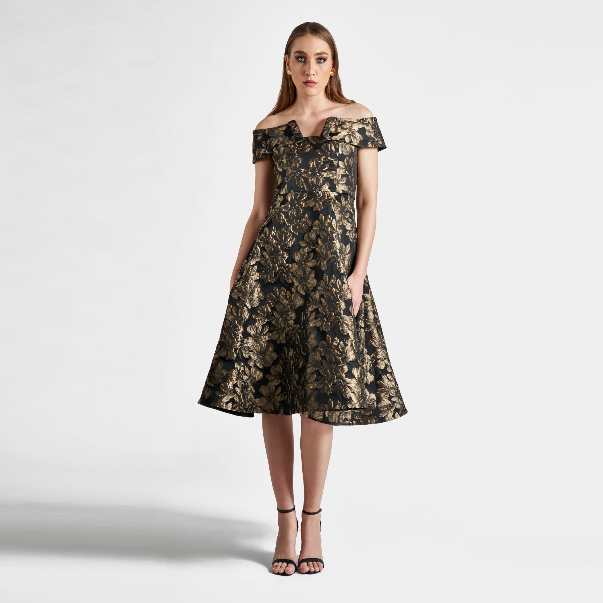 El vestido Catherine es la elección perfecta para cualquier ocasión, combinando nuestro diseño de hombros descubiertos más vendido con un lujoso brocado antiguo en oro y negro. Su silueta entallada y acampanada te hará destacar con sofisticación y elegancia. Edición limitada.