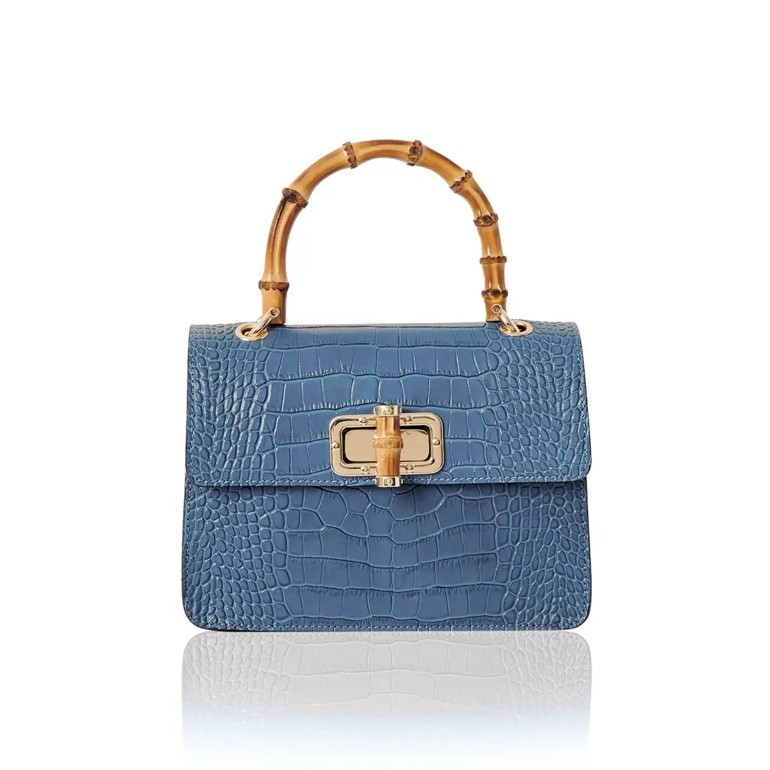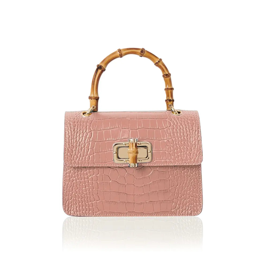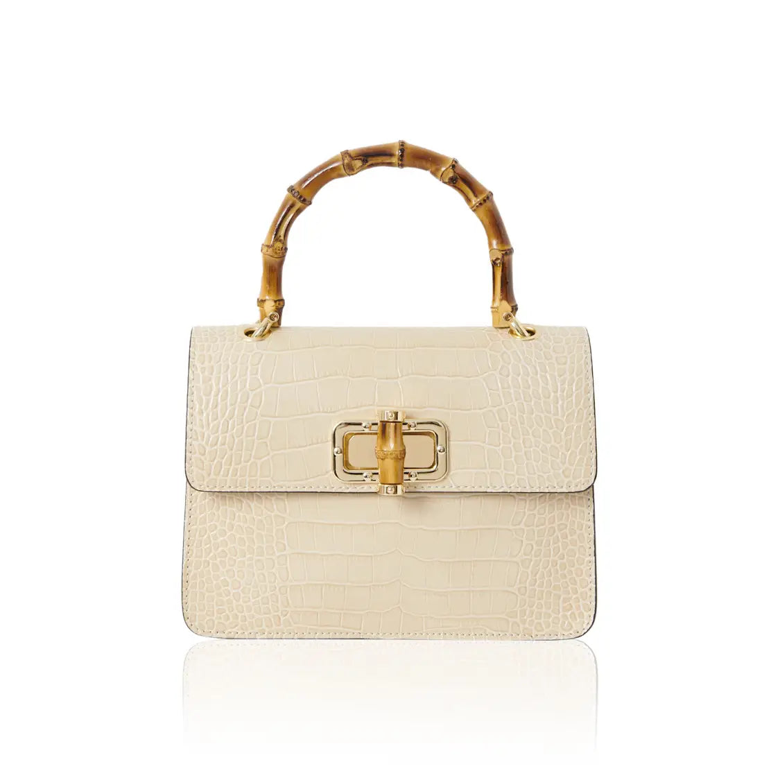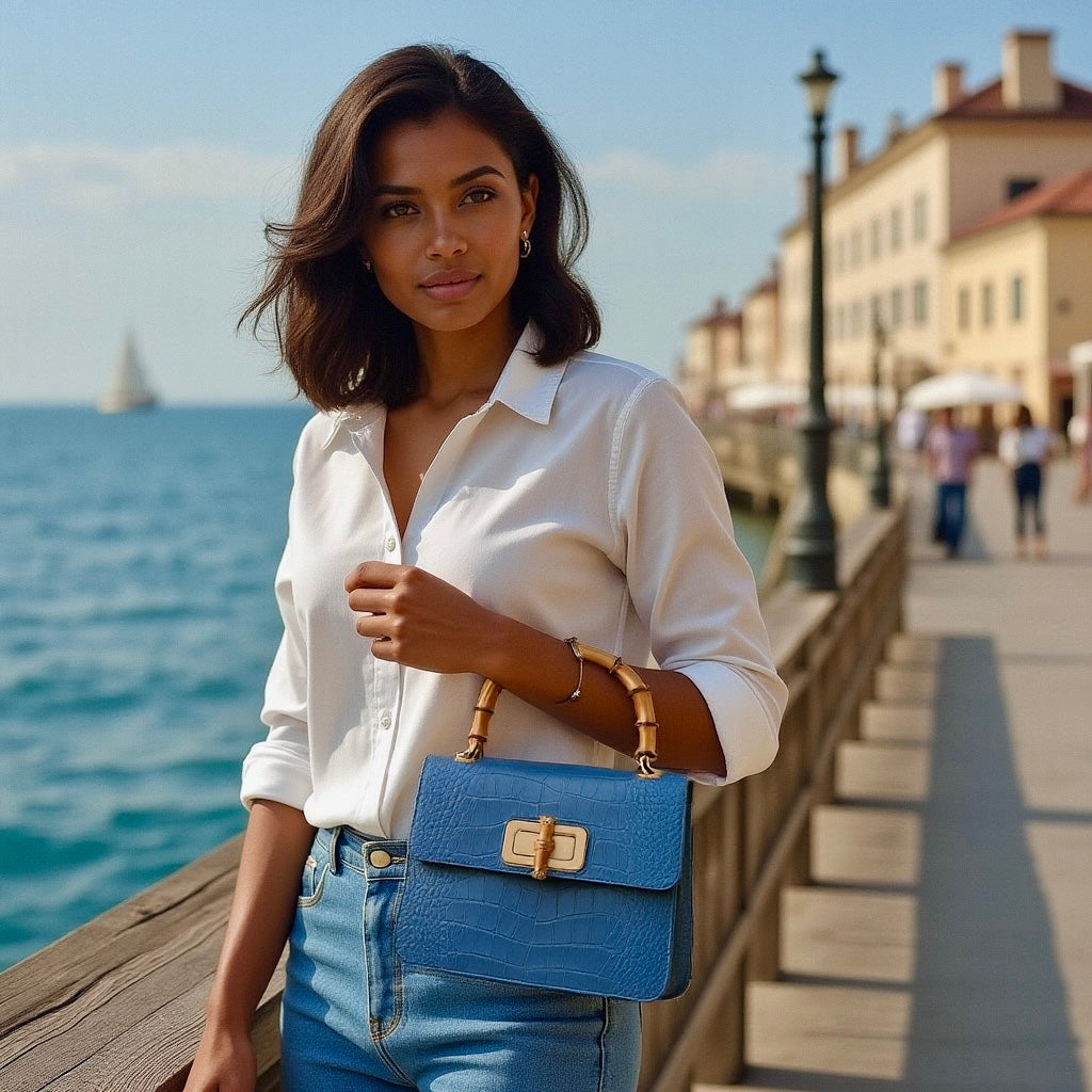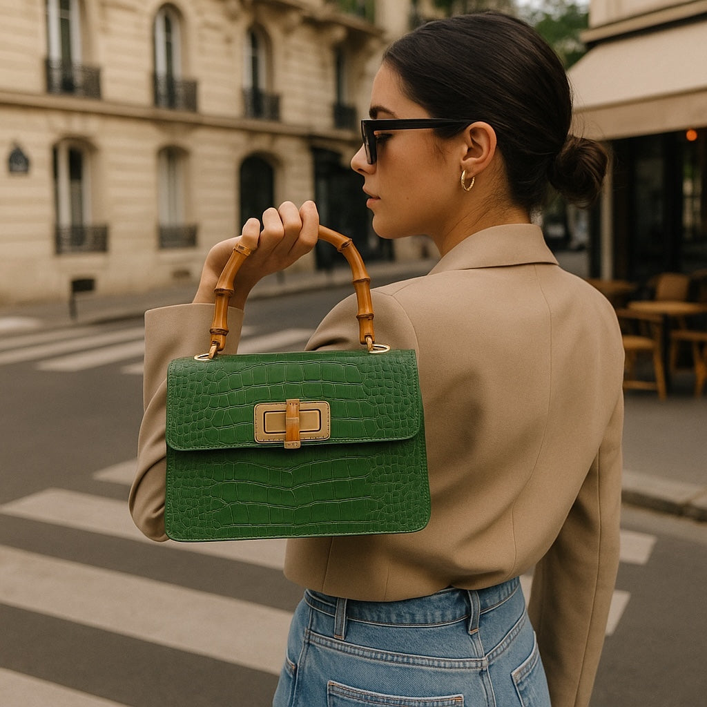 El bolso MINI HARRIET combina a la perfección sofisticación y un estilo retro. Confeccionado en piel italiana con relieve de cocodrilo, este bolso cuenta con un asa superior de bambú auténtico y un cierre entrelazado de metal y bambú. Su tamaño es ideal tanto para el día como para la noche, y te garantiza un look único.