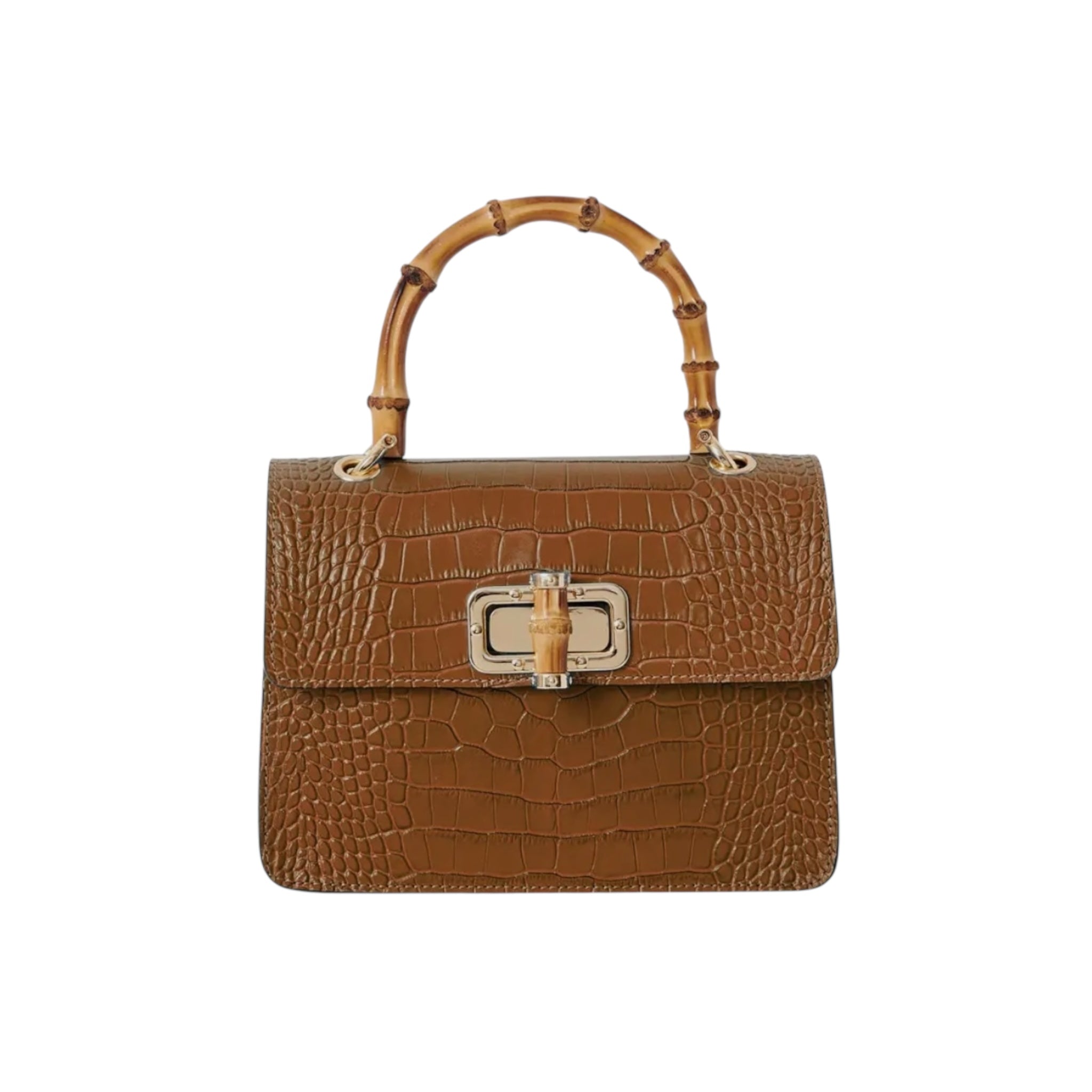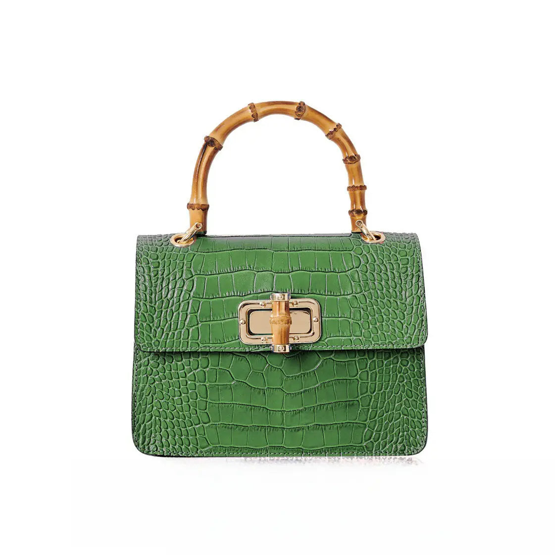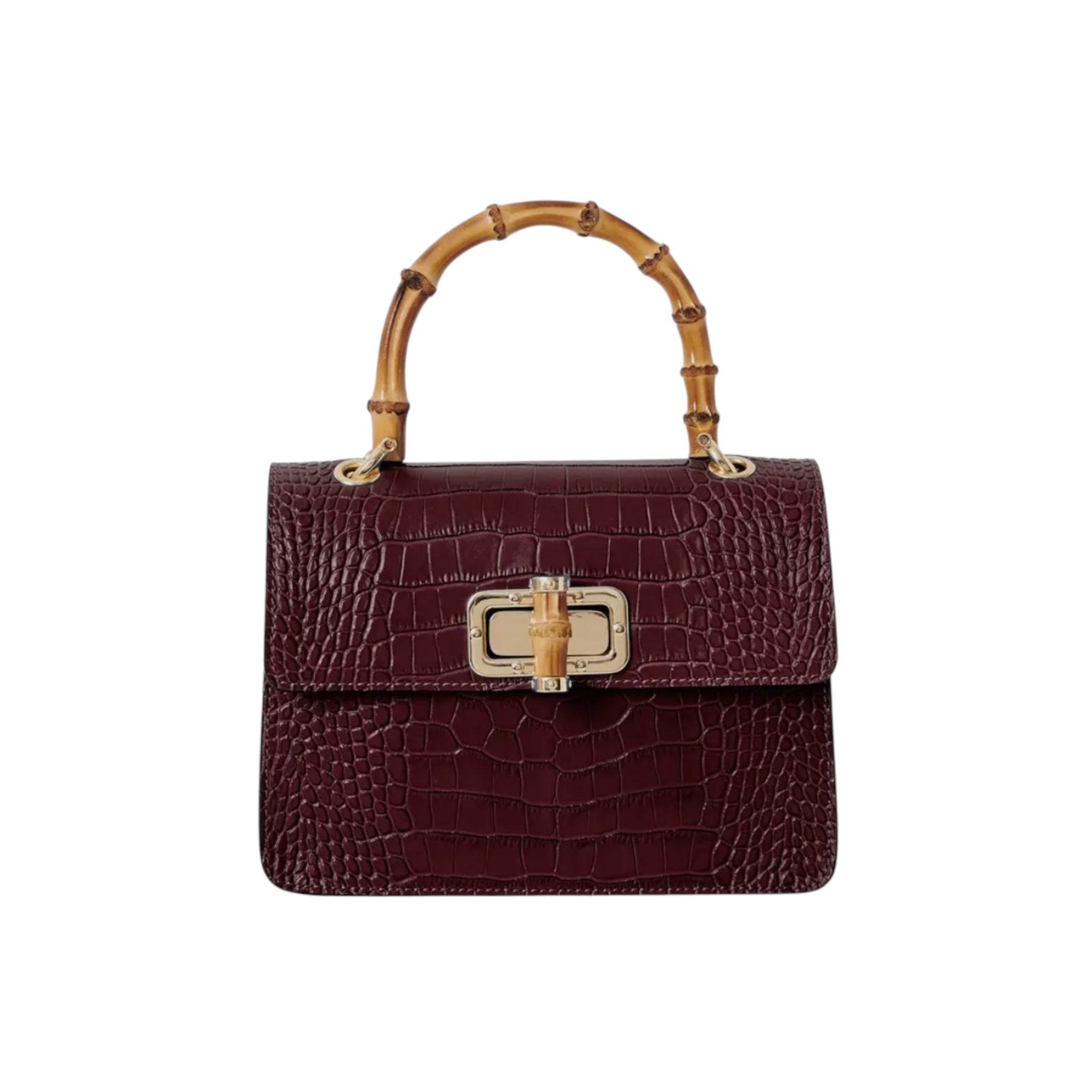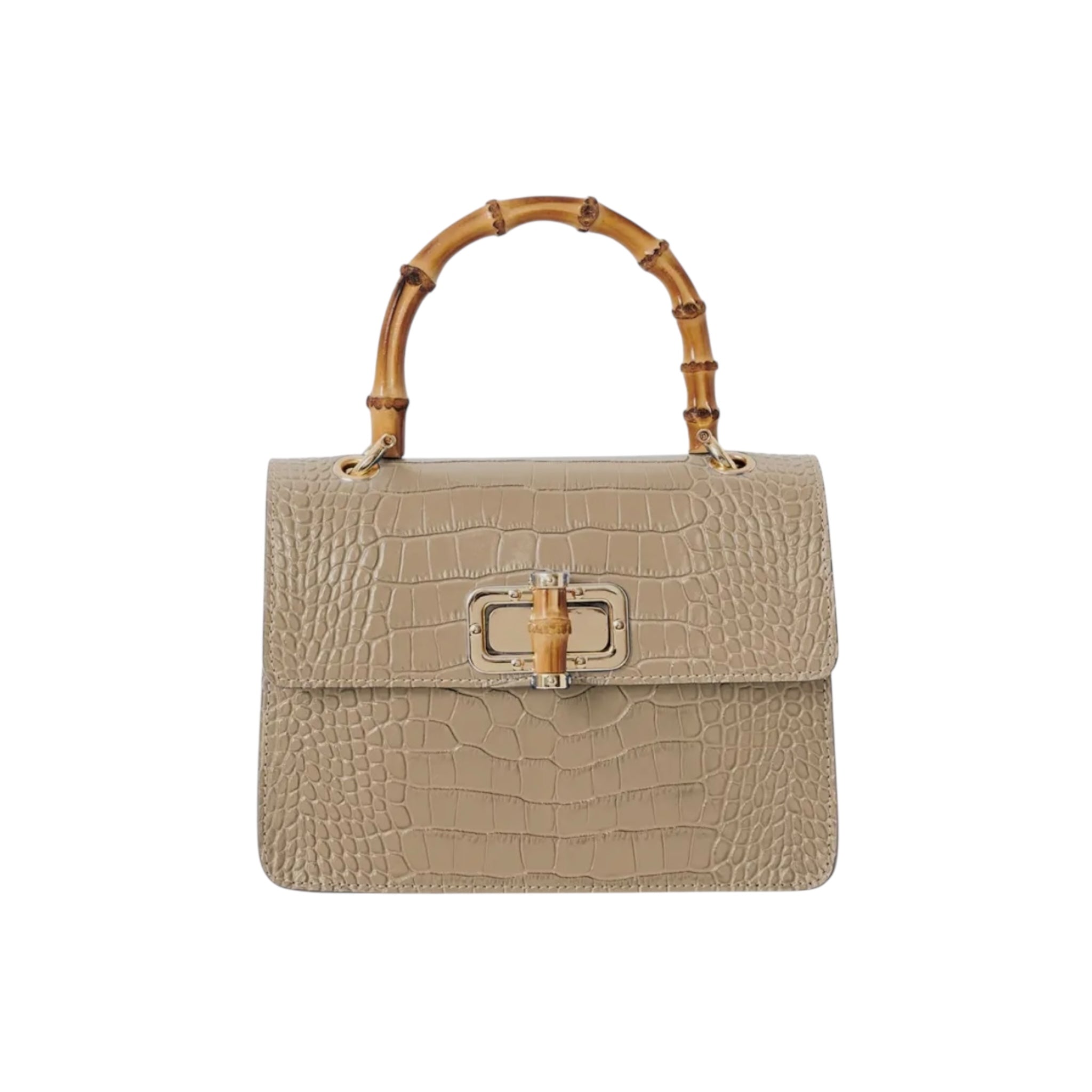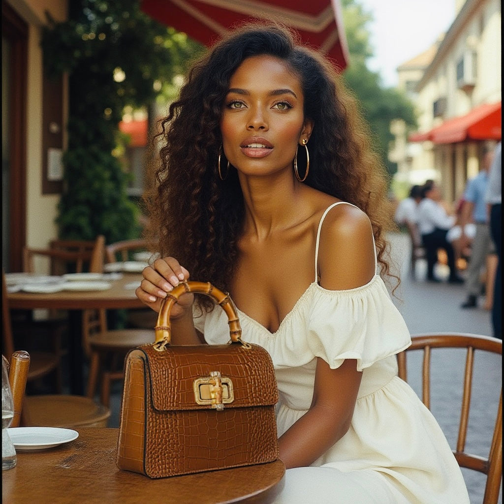El bolso MINI HARRIET combina a la perfección sofisticación y un estilo retro. Confeccionado en piel italiana con relieve de cocodrilo, este bolso cuenta con un asa superior de bambú auténtico y un cierre entrelazado de metal y bambú. Su tamaño es ideal tanto para el día como para la noche, y te garantiza un look único.