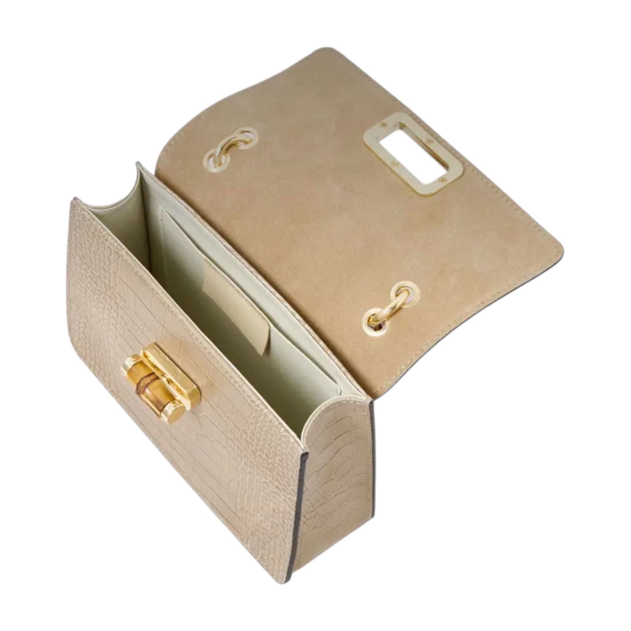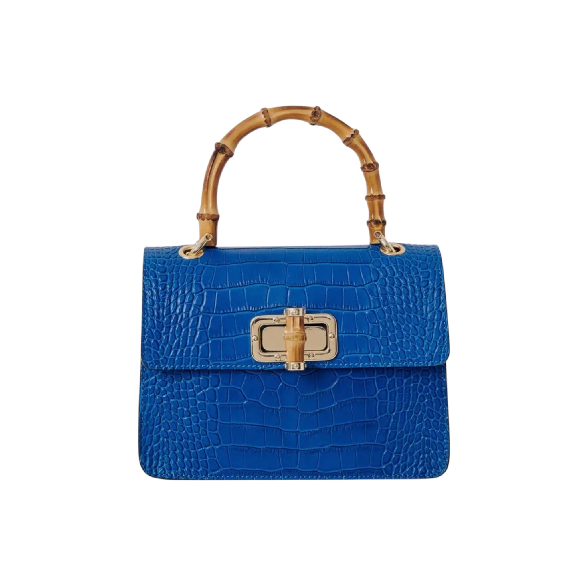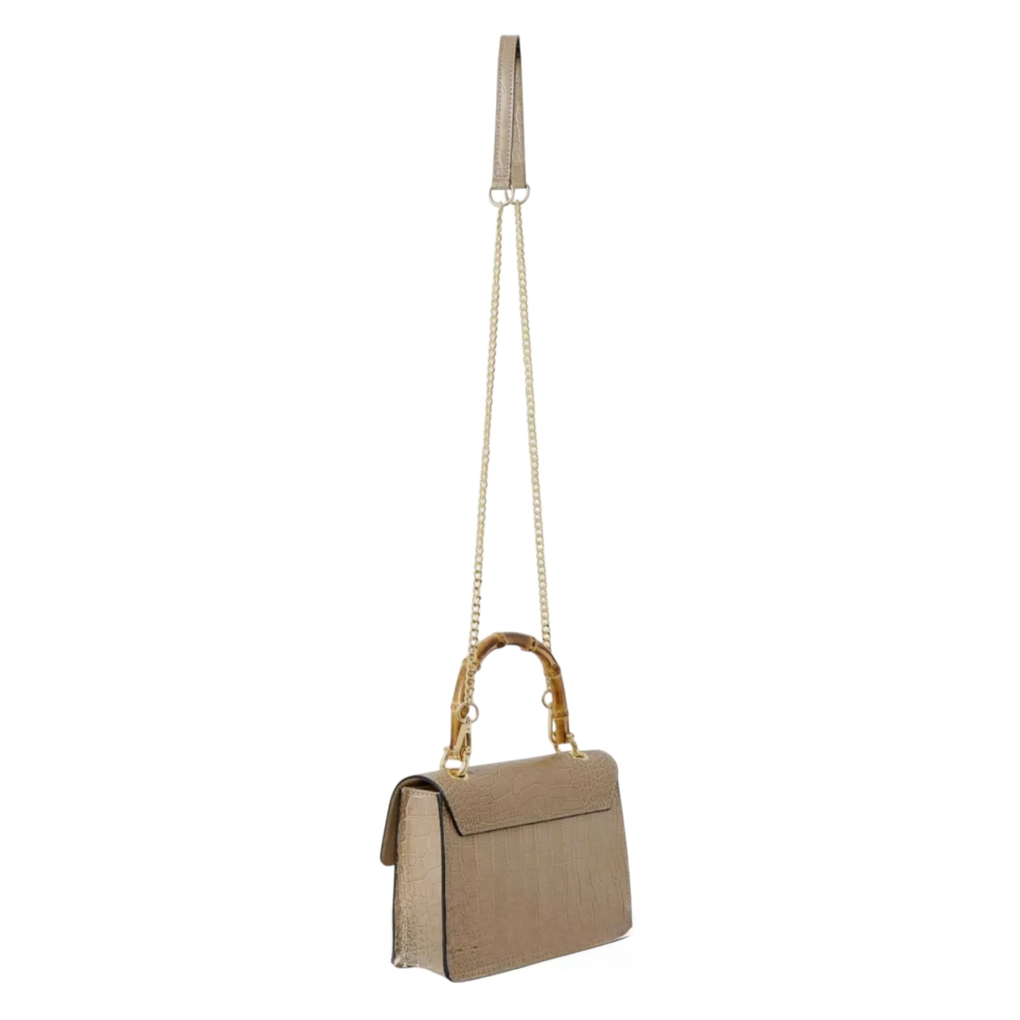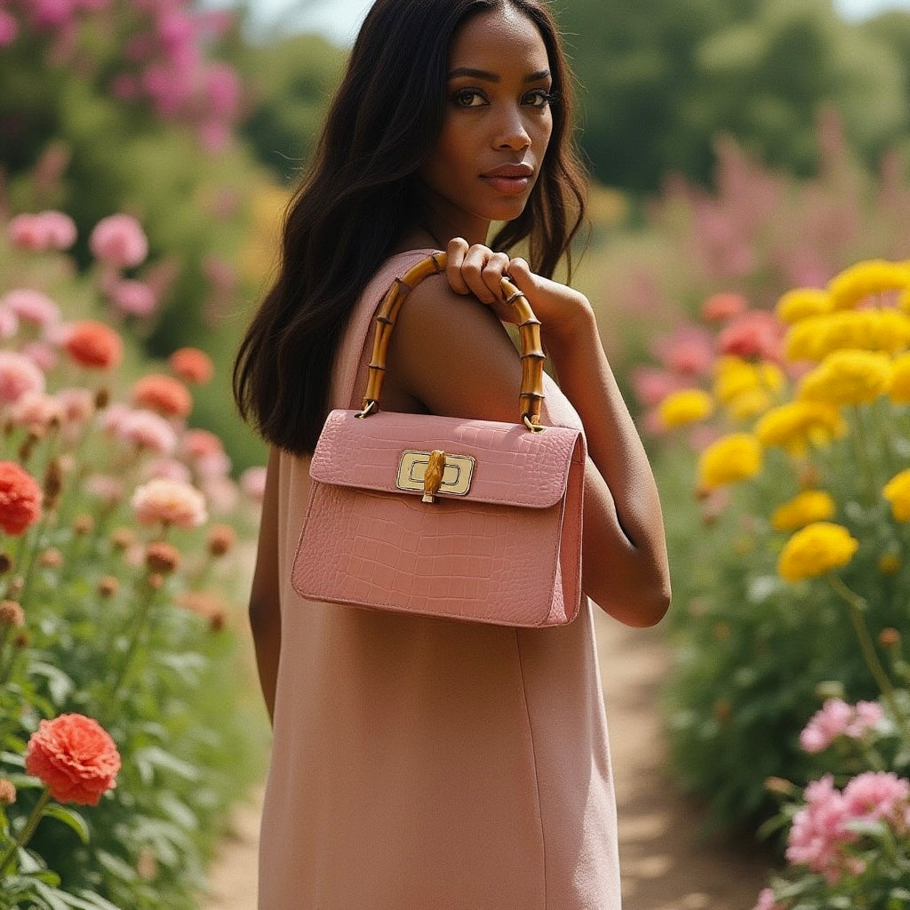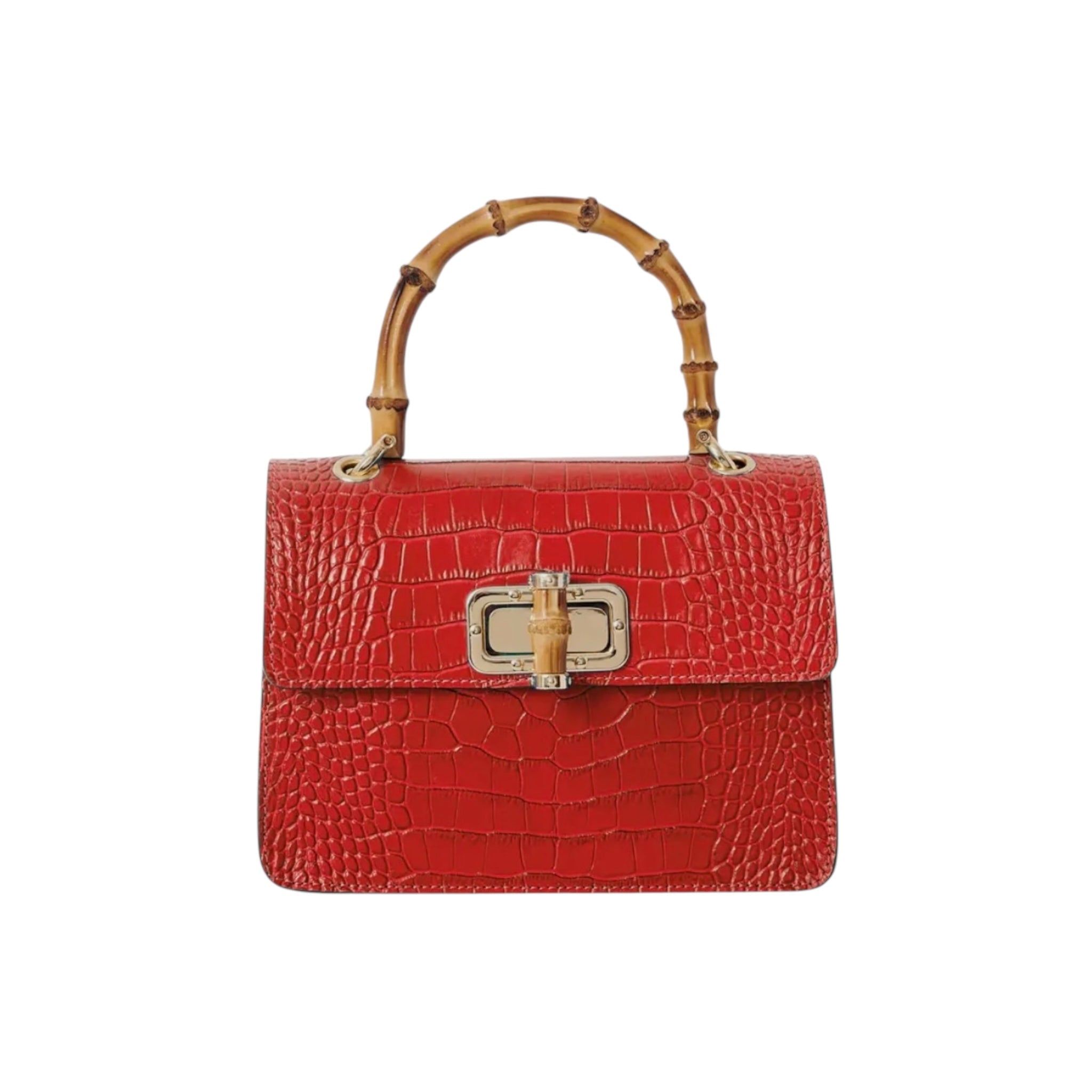 El bolso MINI HARRIET combina a la perfección sofisticación y un estilo retro. Confeccionado en piel italiana con relieve de cocodrilo, este bolso cuenta con un asa superior de bambú auténtico y un cierre entrelazado de metal y bambú. Su tamaño es ideal tanto para el día como para la noche, y te garantiza un look único.