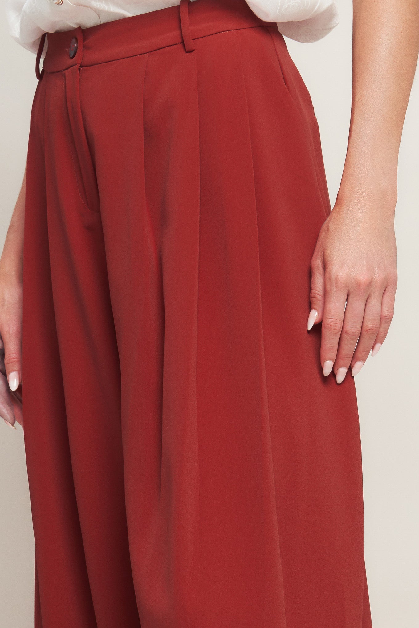 Un pantalón de tejido liso con cierre frontal, pliegues delanteros, bolsillos laterales y pernera ancha.