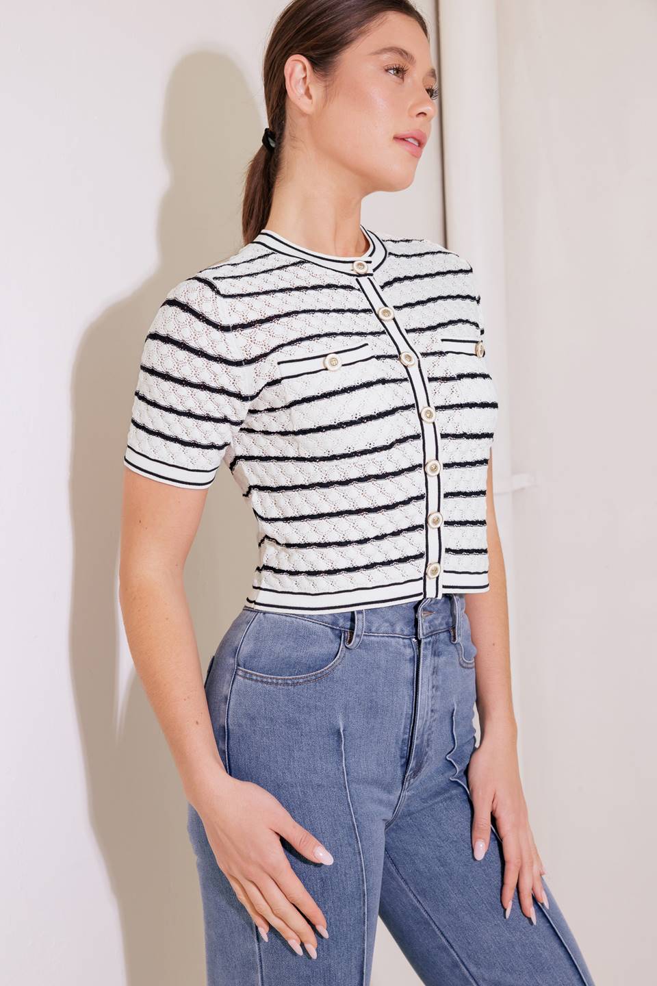 A sweater knit cardigan featuring round neckline, short sleeve, front pocket and button down