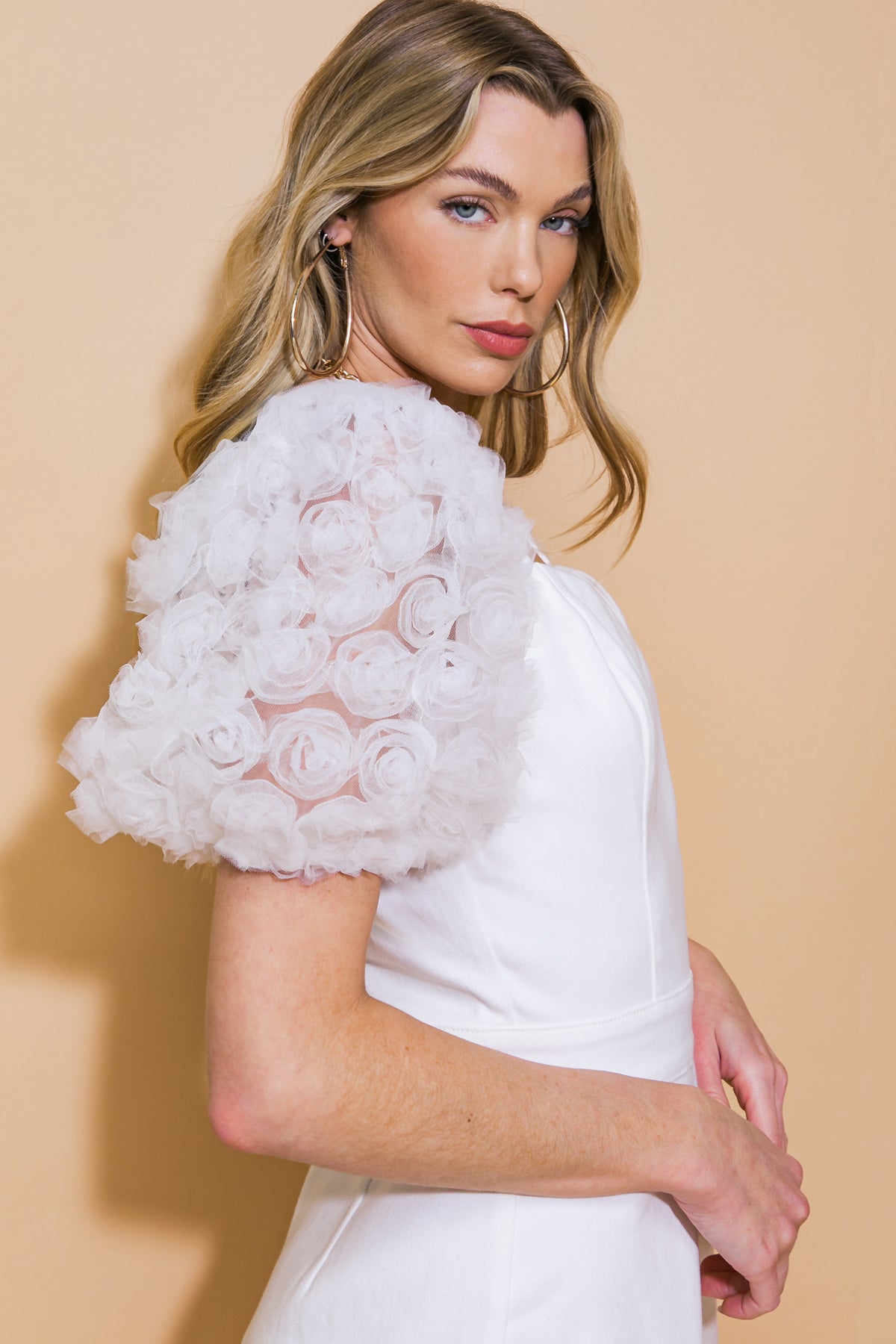 A twill romper featuring sweetheart neckline, contrasting sleeve and back zipper closure