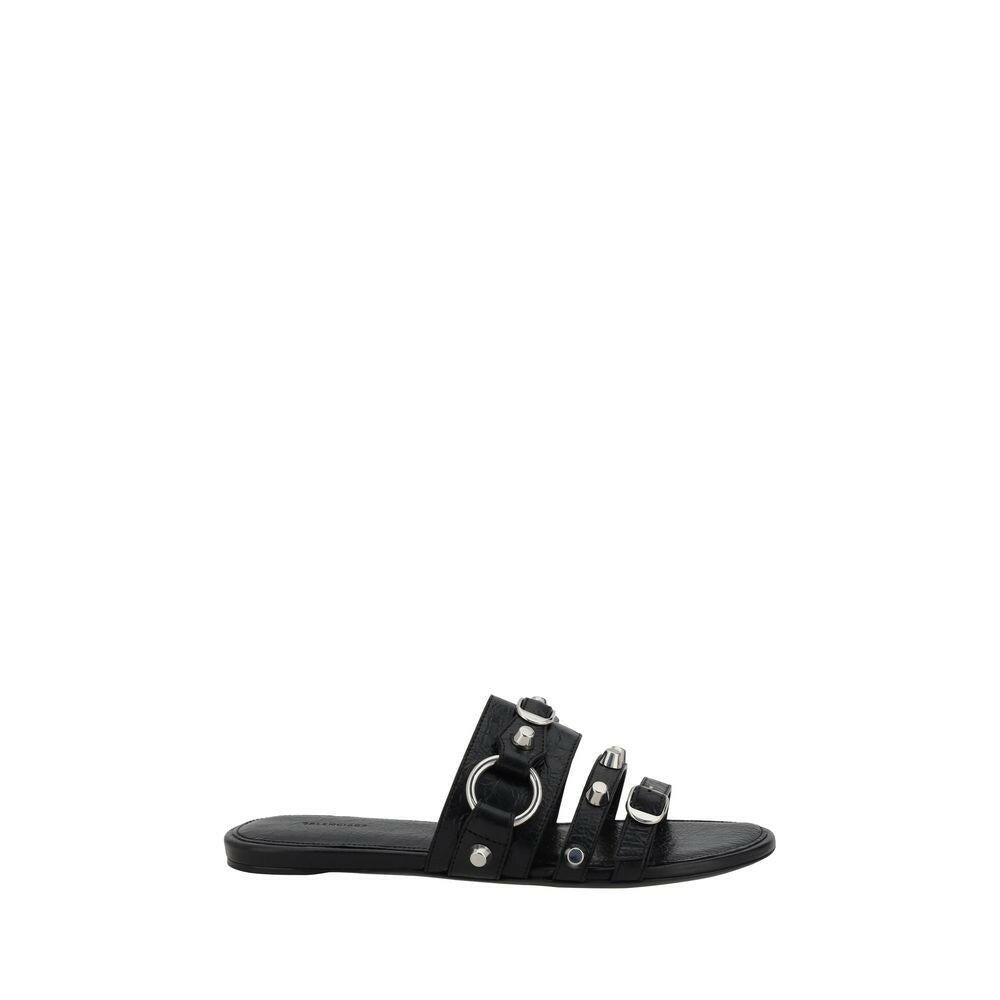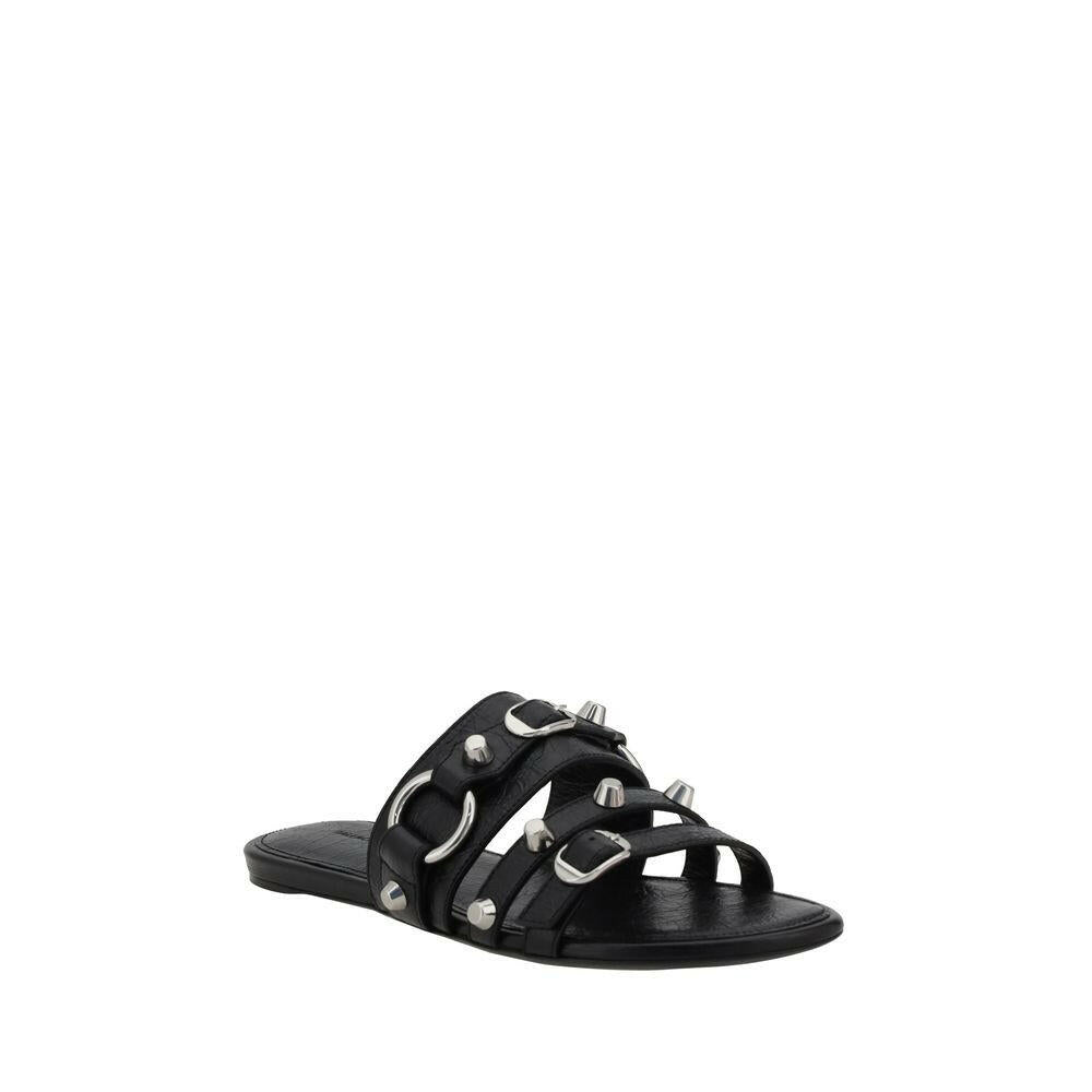 Balenciaga’s studded Sandals combine a bold and sophisticated design. A slip-on model with a flat sole, they feature three front straps decorated with silver studs and rings, giving them a modern, rock look. These sandals are ideal for adding a touch of character and style to a summer outfit without sacrificing comfort.
