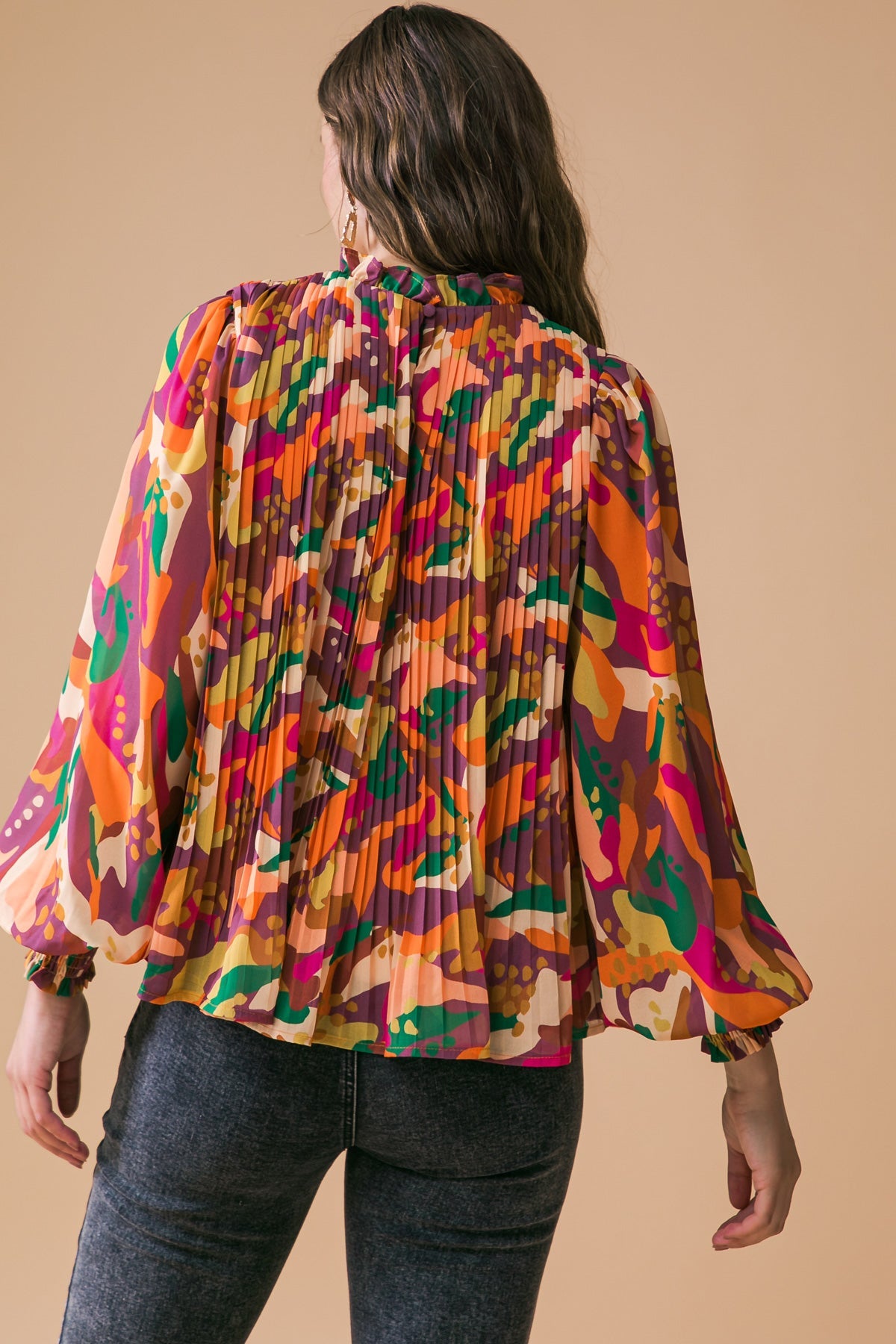A printed woven top featuring ruffled neckline, pleated front, long sleeve, smocked cuff and back button closure