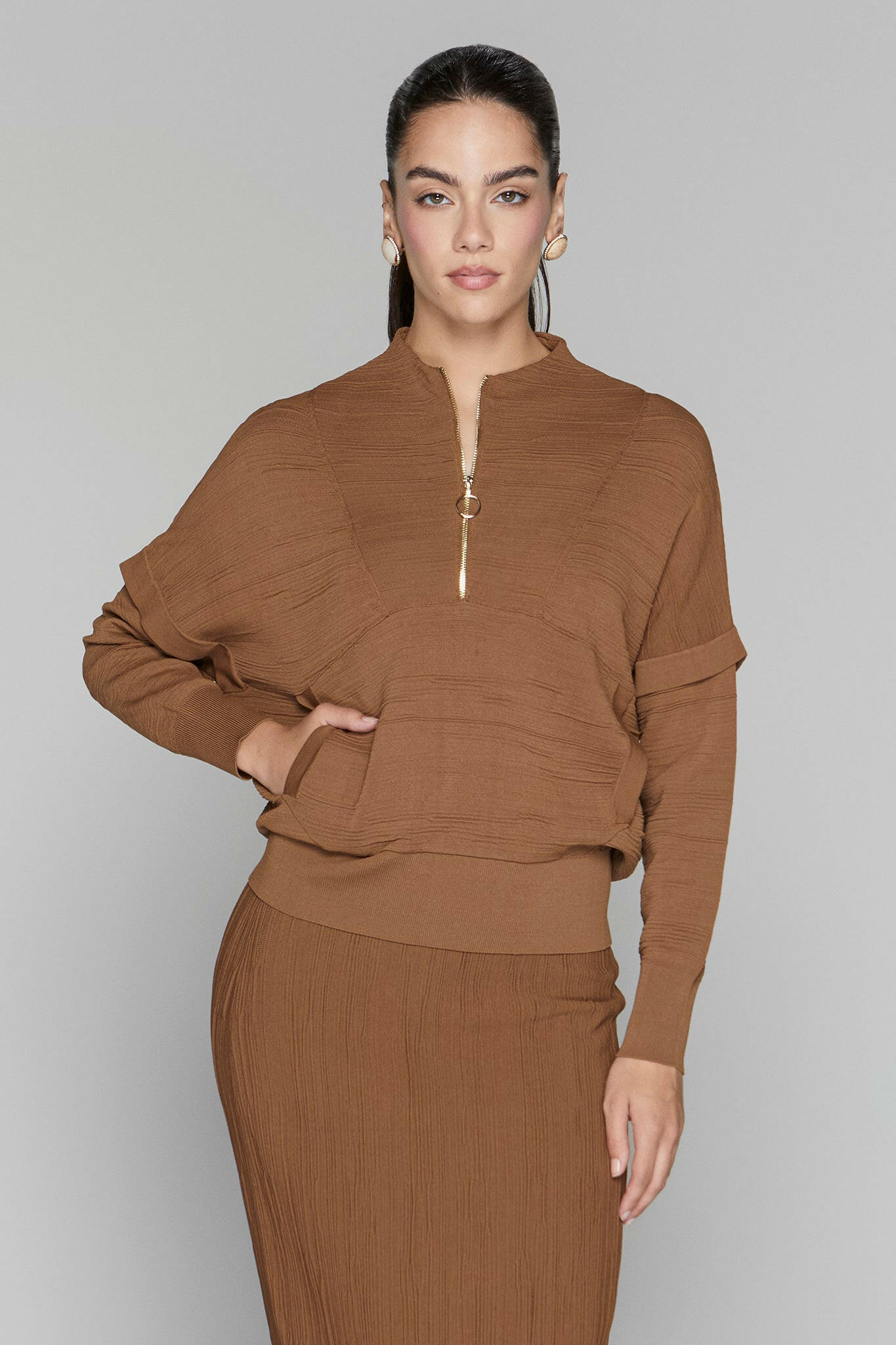 Crafted from a gauze-like textured knit, the Canton Zip Top delivers effortless elegance with its relaxed, slightly oversized fit and a flattering longer back hem. A refined 1/2-zip neckline and practical front pocket add both style and function, while the soft texture lends modern ease. Pair it with the Canton Maxi Skirt for a polished, coordinated look that moves seamlessly from casual days to getaways.