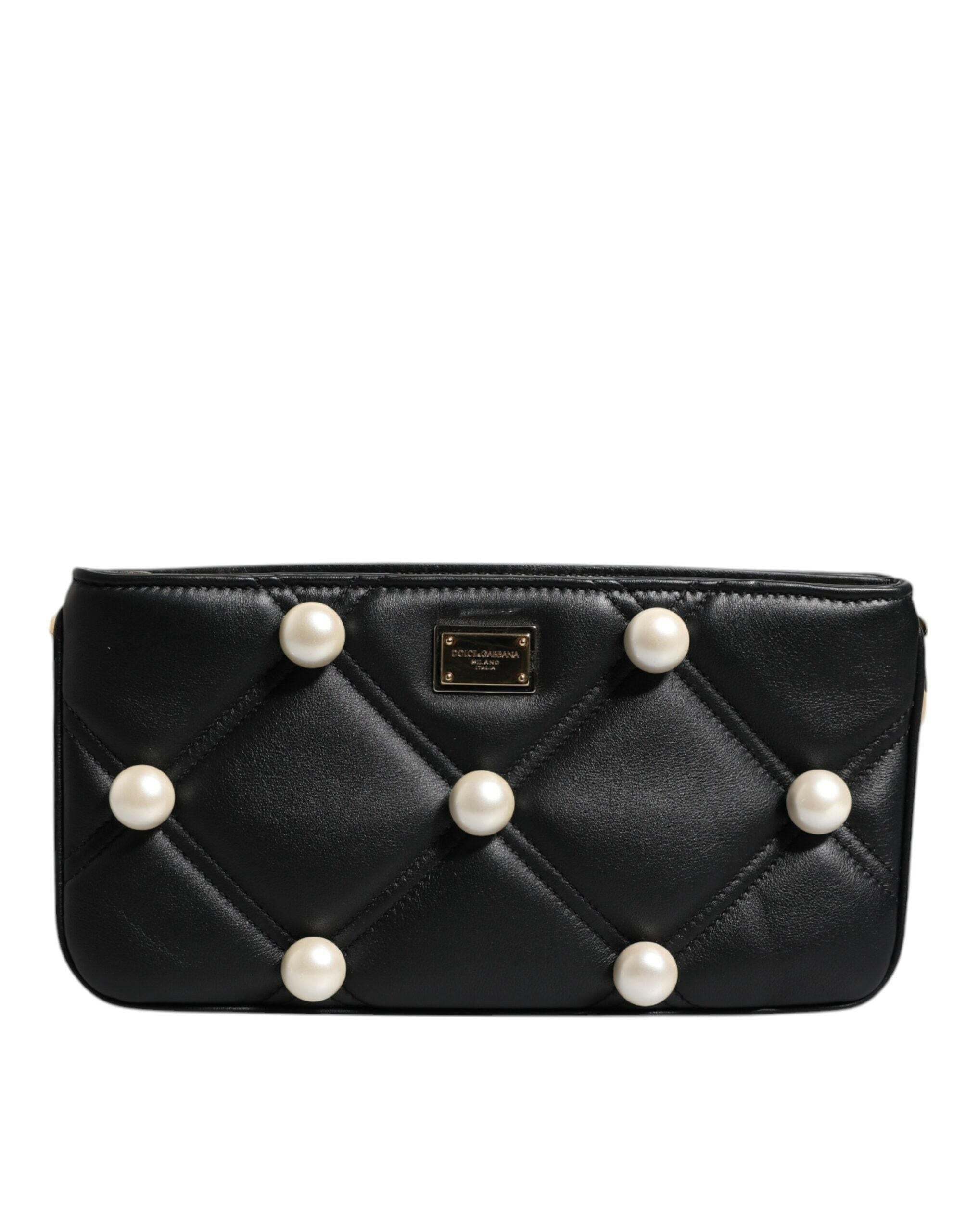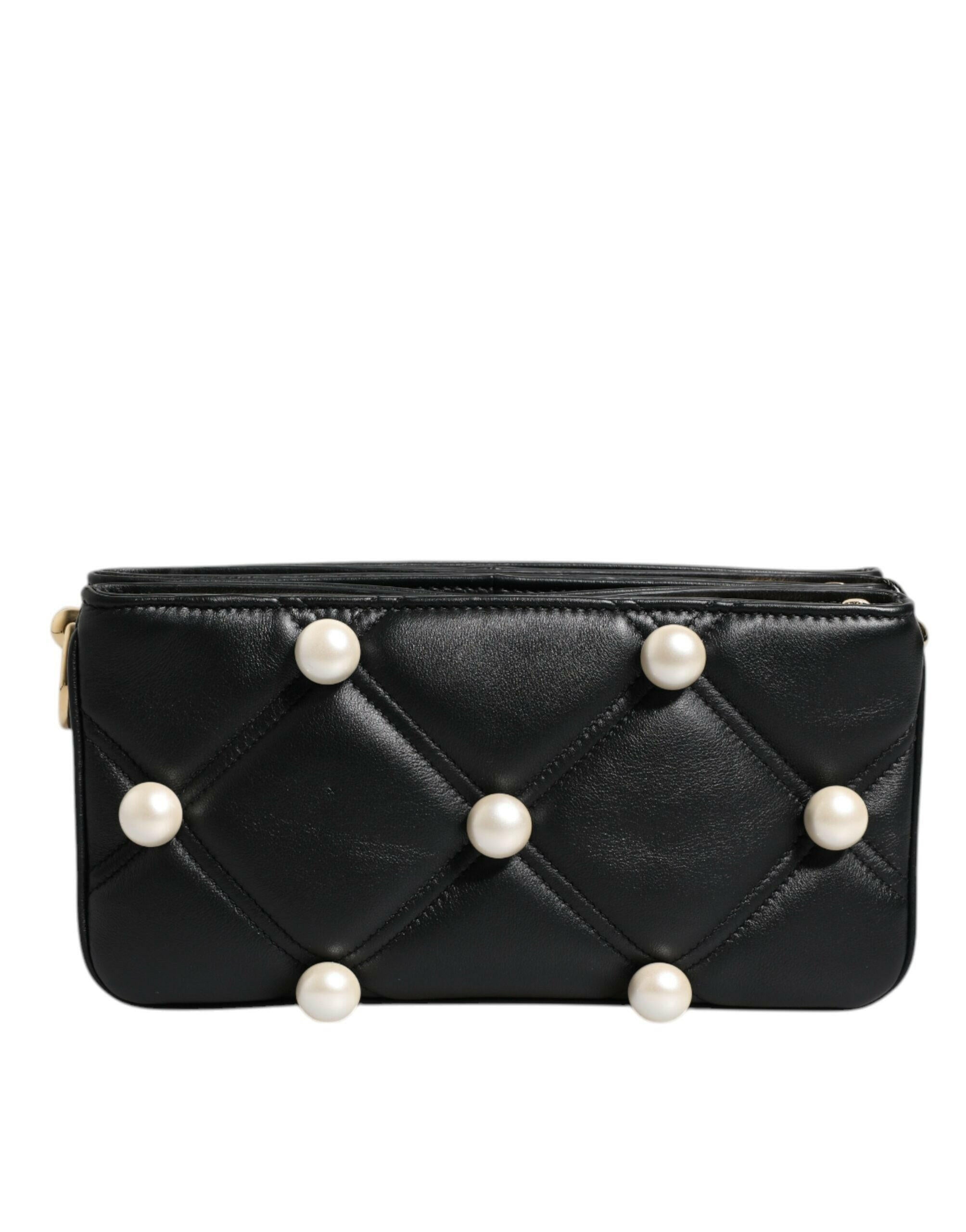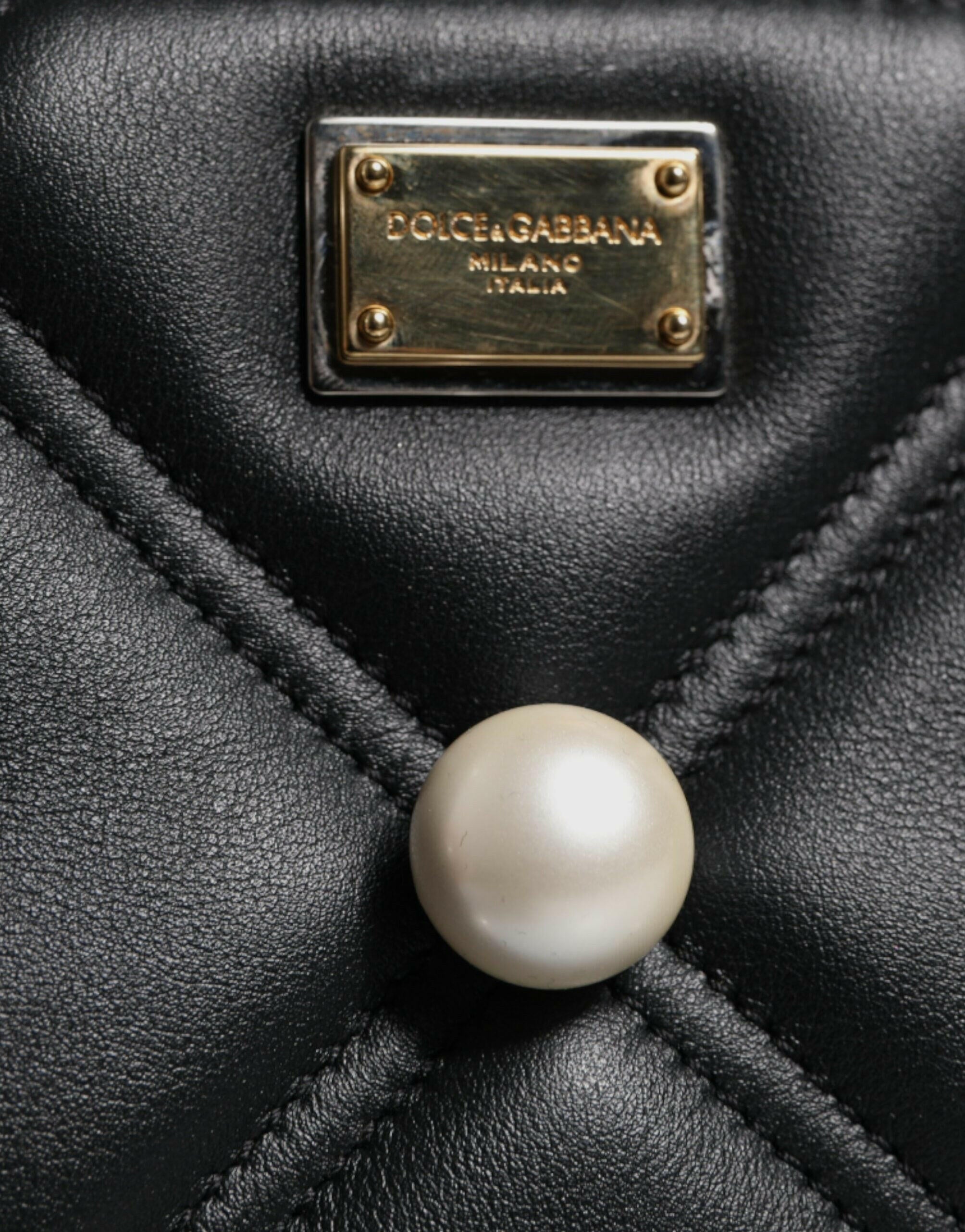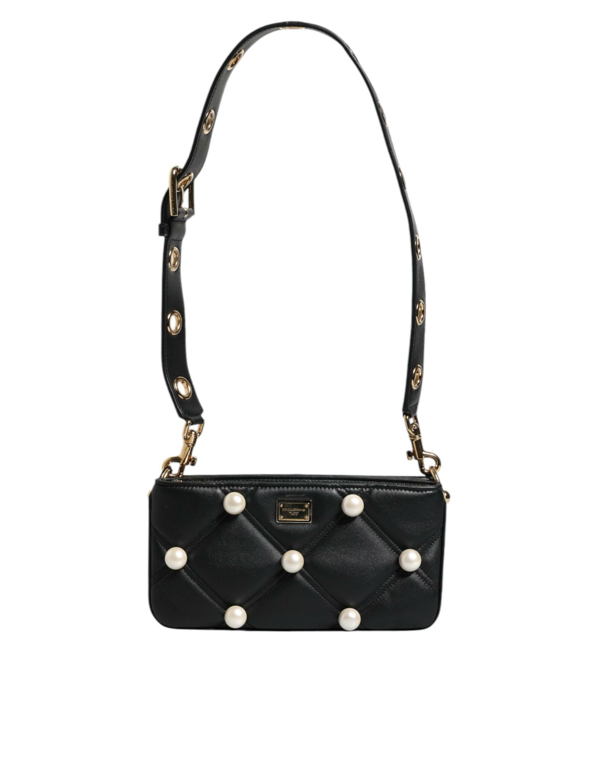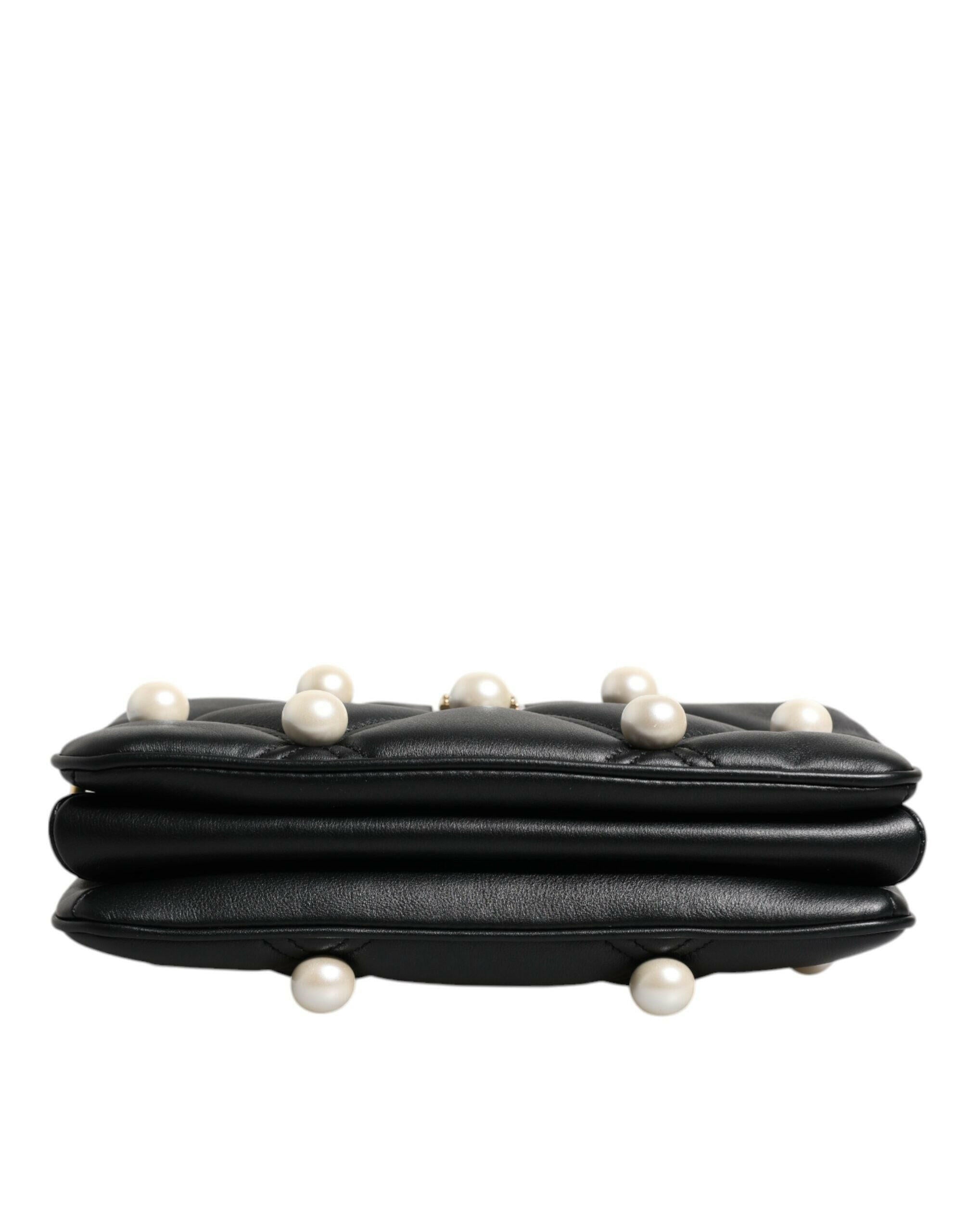 Dolce & Gabbana Black Leather Pearl Embellished Logo Shoulder Bag