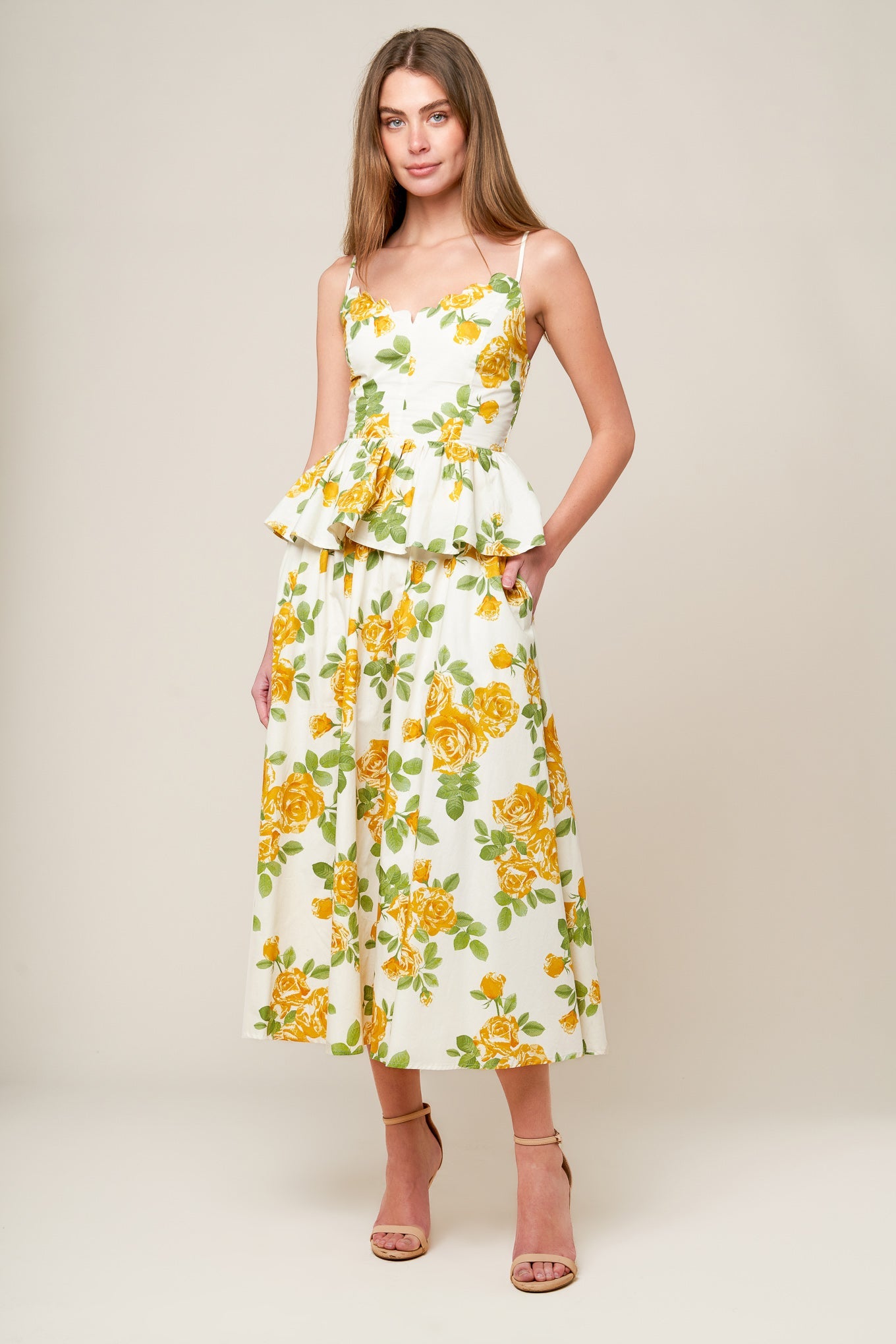 A printed woven top featuring scalloped V neckline, straps, peplum, full skirt and smocked back bodice