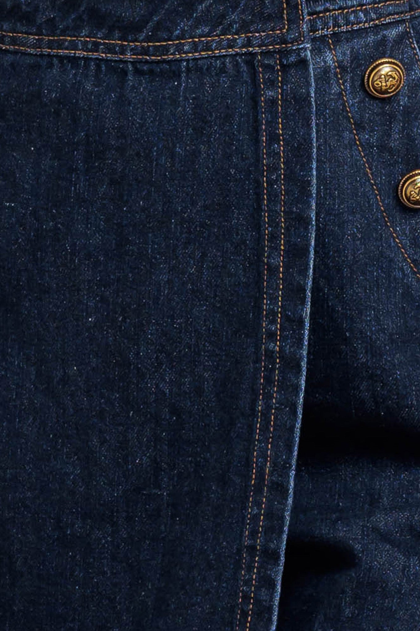 A denim skort featuring side pockets with button detail and back zipper closure. Matching jacket FJ1270