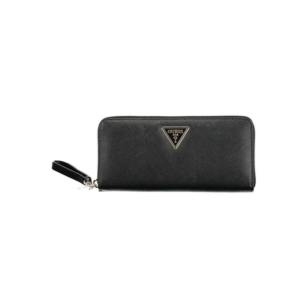 Elevate your accessory game with the Guess Jeans’ quintessential wallet, a true embodiment of style meeting function. This polished black wallet is designed with organization in mind, featuring four spacious compartments, a secure coin purse, and double the space for your cards. An external pocket provides quick access for on-the-go essentials, while the zip closure ensures everything stays in place. The removable drawer adds a layer of versatility, framed by eye-catching contrasting details. Flaunt the iconic Guess logo with every purchase you make.