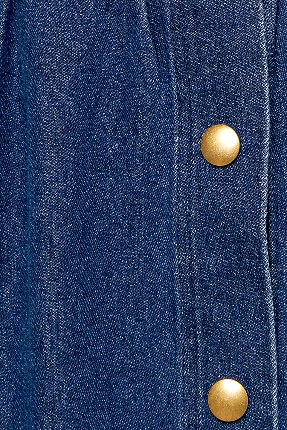 A washed denim top and skirt set. Top featuring cropped length, straight neckline, strap and back zipper closure. Skirt featuring full skirt with front button closure.