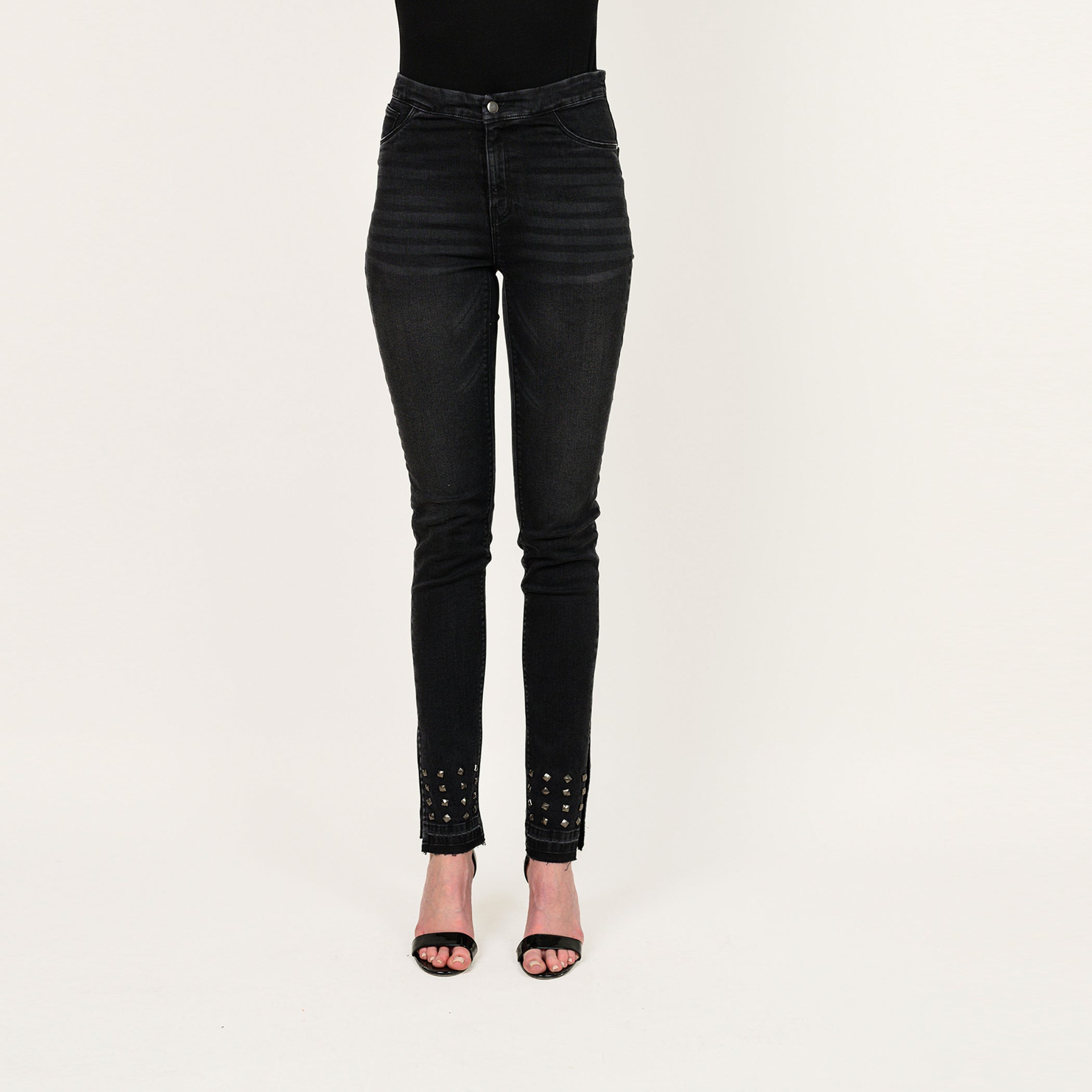 Made from our premium stone washed black denim, this skinny convi with sexy slits at the side of legs takes anΒ rockishΒ twist when combined with the antique silver spike studs placed the bottom of the legΒ opening.