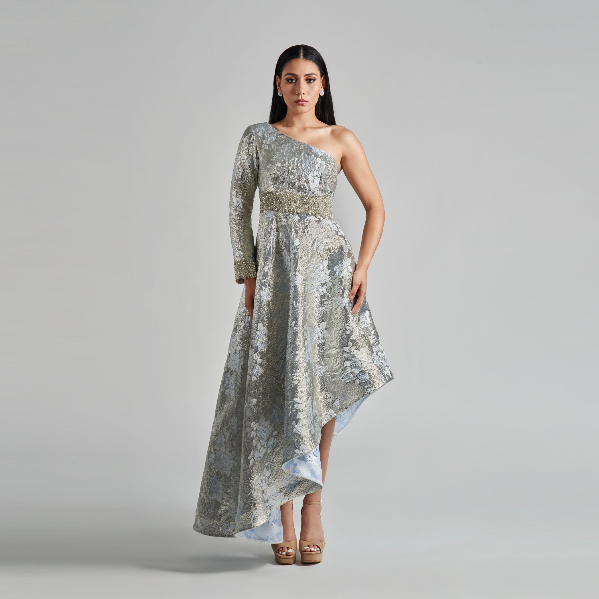 Experience the elegance and exclusivity of The Jennifer. This stunning one shoulder fit & flare gown drapes asymmetrically with a high low skirt, all crafted from luxurious silver lurexed brocade fabric. Adorned with hand beaded crystals at the waist and cuffs, this masterpiece is designed to dazzle and leave a lasting impression.