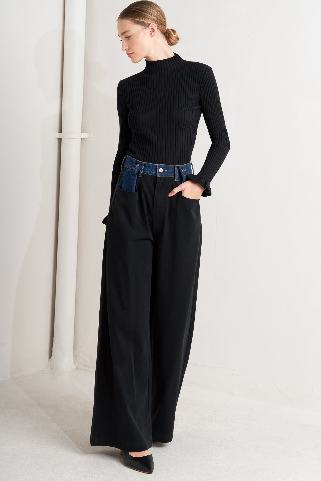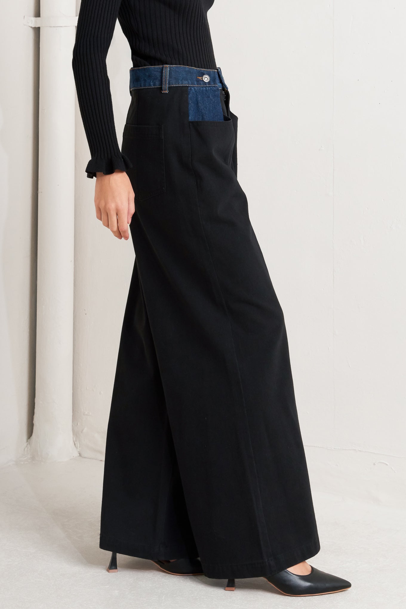 A denim pant with pockets and wide leg