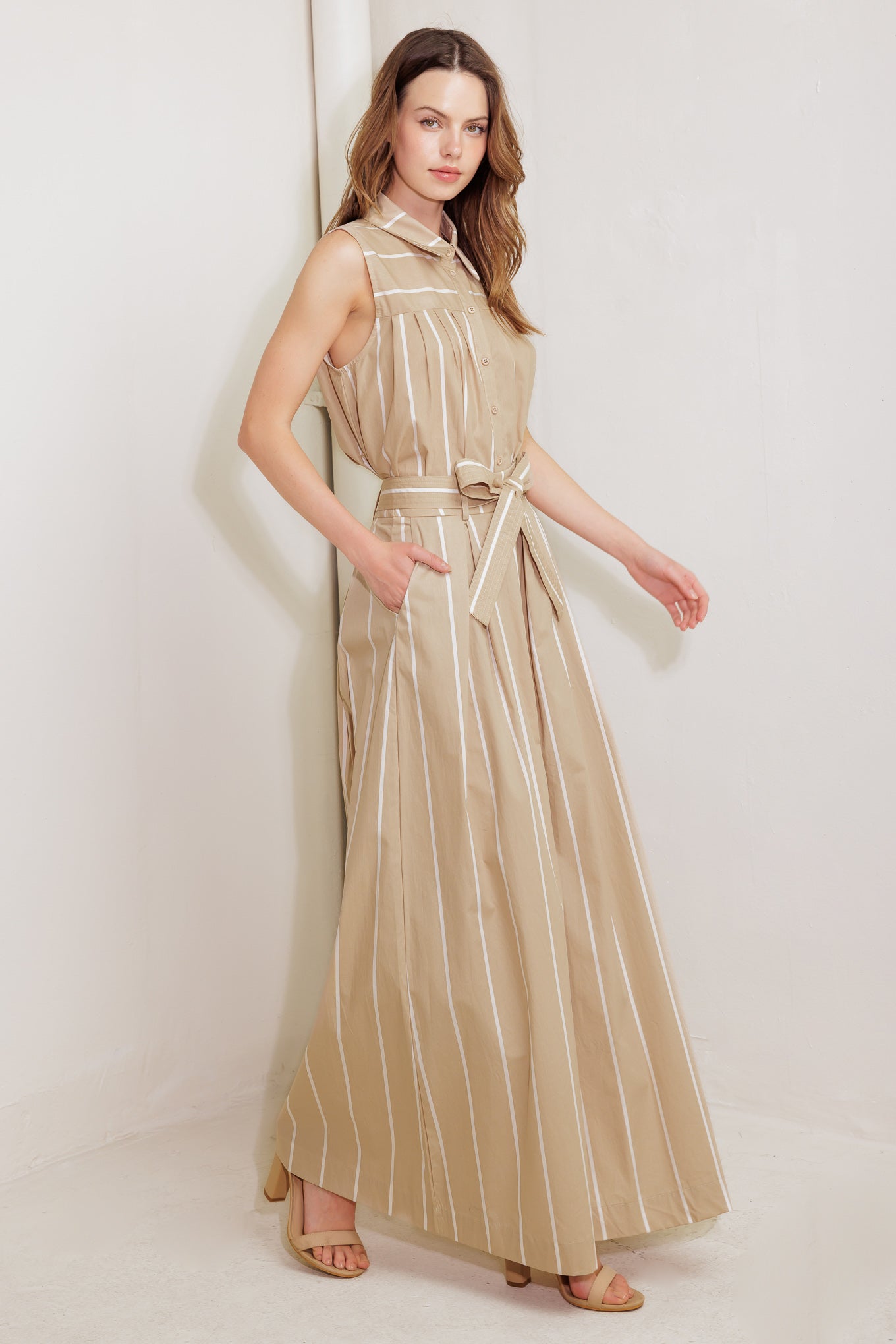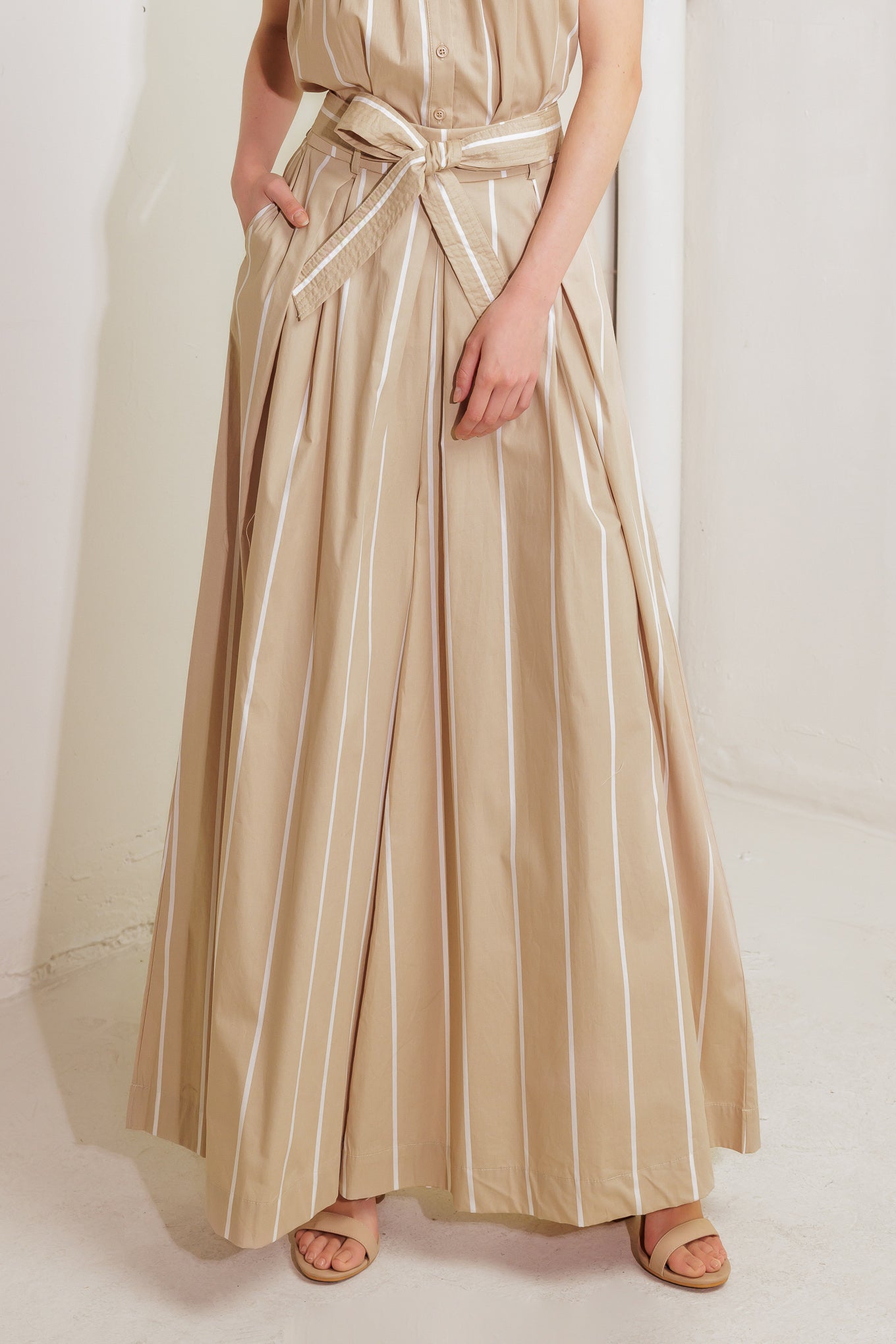 A striped woven pant featuring front pleat, self sash tie and extra wide leg.