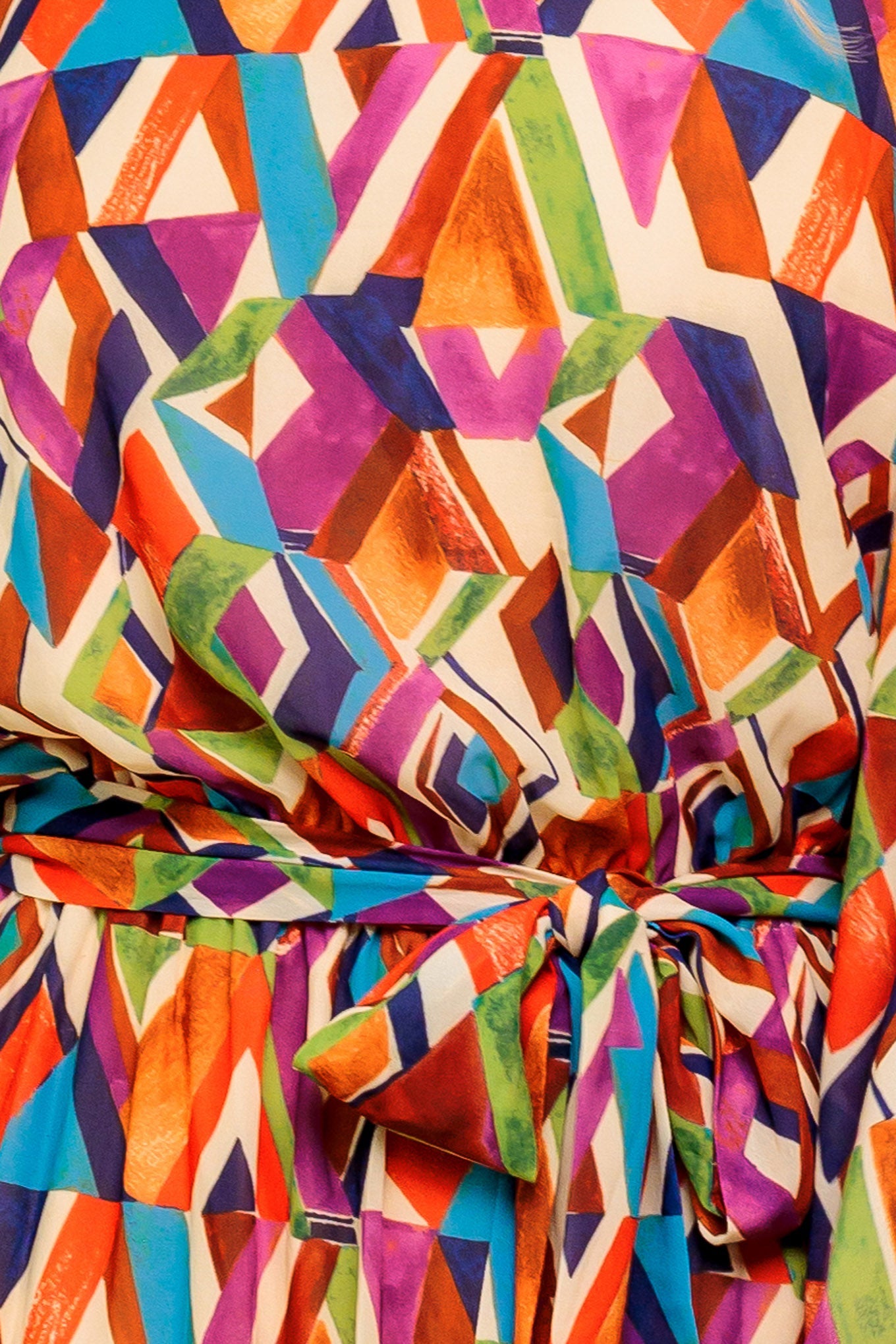 A printed woven midi dress featuring round neckline, long sleeve, elasticized waist with self tie and tiered skirt