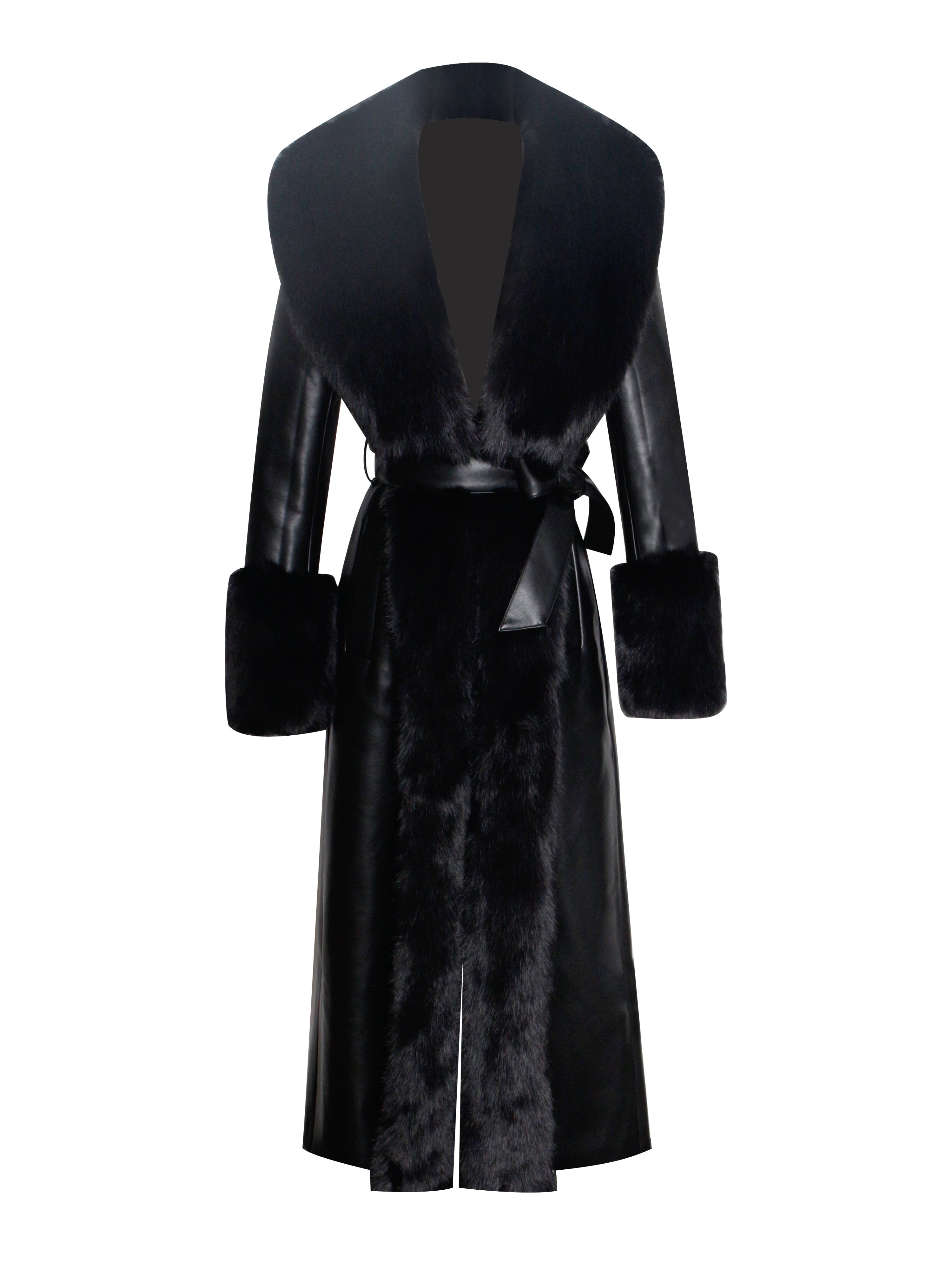 Indulge in opulence with our high quality Zaida Black Vegan Fur Trim Vegan Leather Coat. This stunning maxi coat exudes luxury, adorned with puffy fur trim along the neckline and sleeve openings. Crafted from premium vegan leather and soft vegan fur, it is fully lined for comfort. The coat features a large snap inside the center waist, along with belt loops and a slender leather belt for effortless closure. Versatile and chic, it adds a touch of sophisticated glamour to any special occasion. Choose between the sleek all-black design or the striking black with white details for a show-stopping look. Why buy real when our faux feels the same!