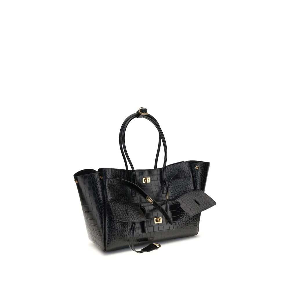 A bolsa de ombro média Bel Air da Balenciaga é um acessório sofisticado em couro de bezerro com efeito crocodilo. Versátil, pode ser carregada no ombro ou na mão graças às duas alças unidas por um clipe. O logotipo Balenciaga Paris em relevo com laminação destaca-se na parte de trás, enquanto os detalhes em dourado envelhecido e os botões de pressão laterais adicionam personalidade. O fecho giratório, com logotipo gravado, garante segurança, enquanto o interior é organizado com um compartimento grande, bolso frontal, dois bolsos com zíper e dois bolsos planos. Um chaveiro removível com argola dupla em espiral completa o design.