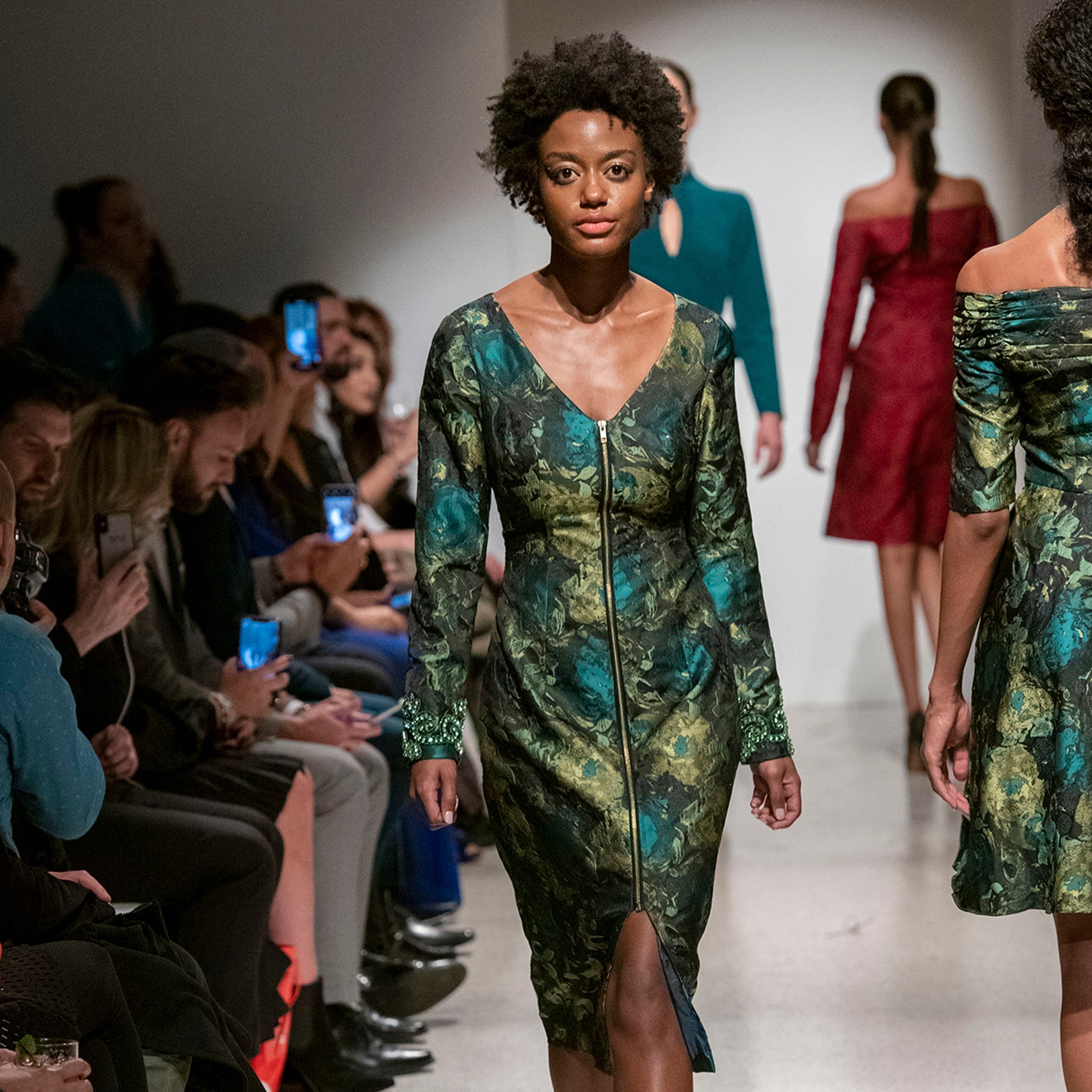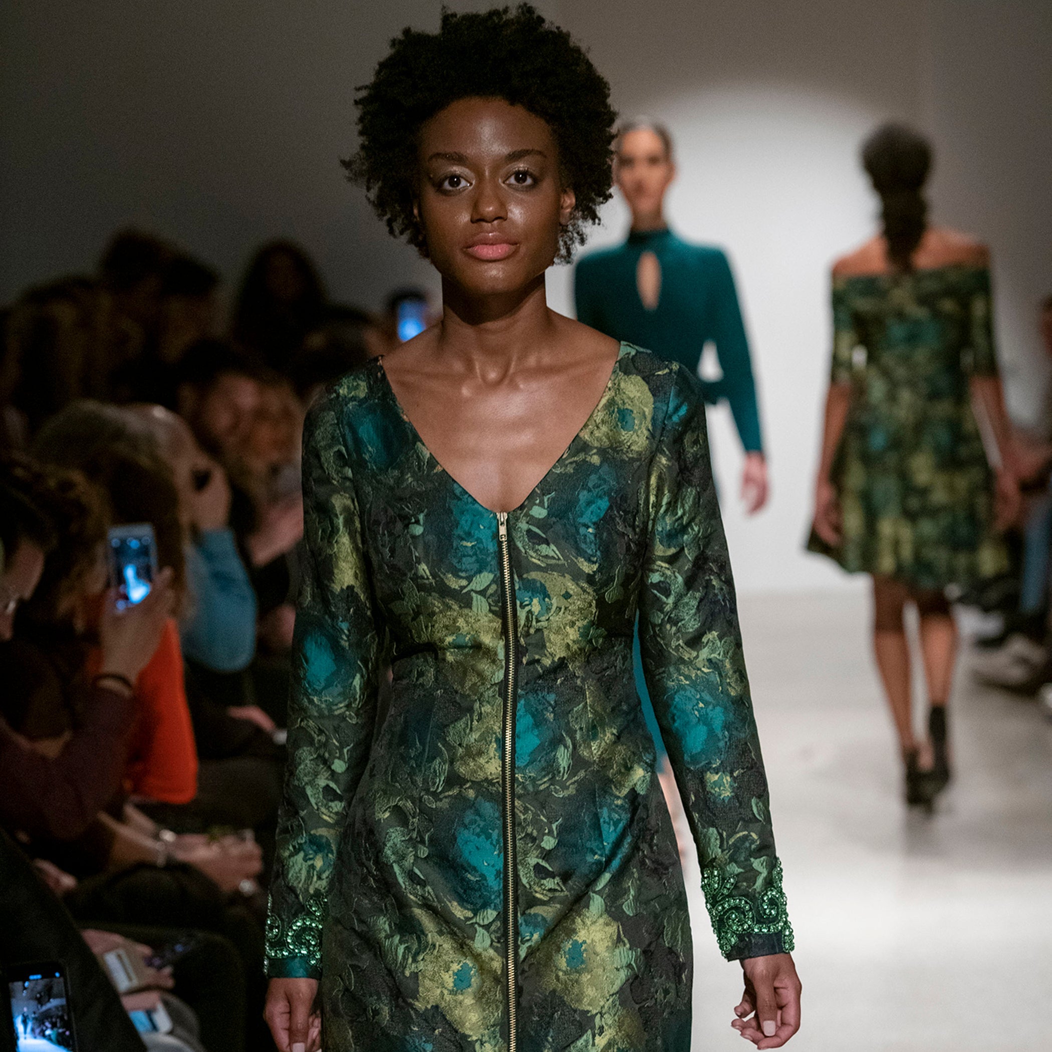 Vestido de manga comprida com zíper frontal e detalhes em miçangas.