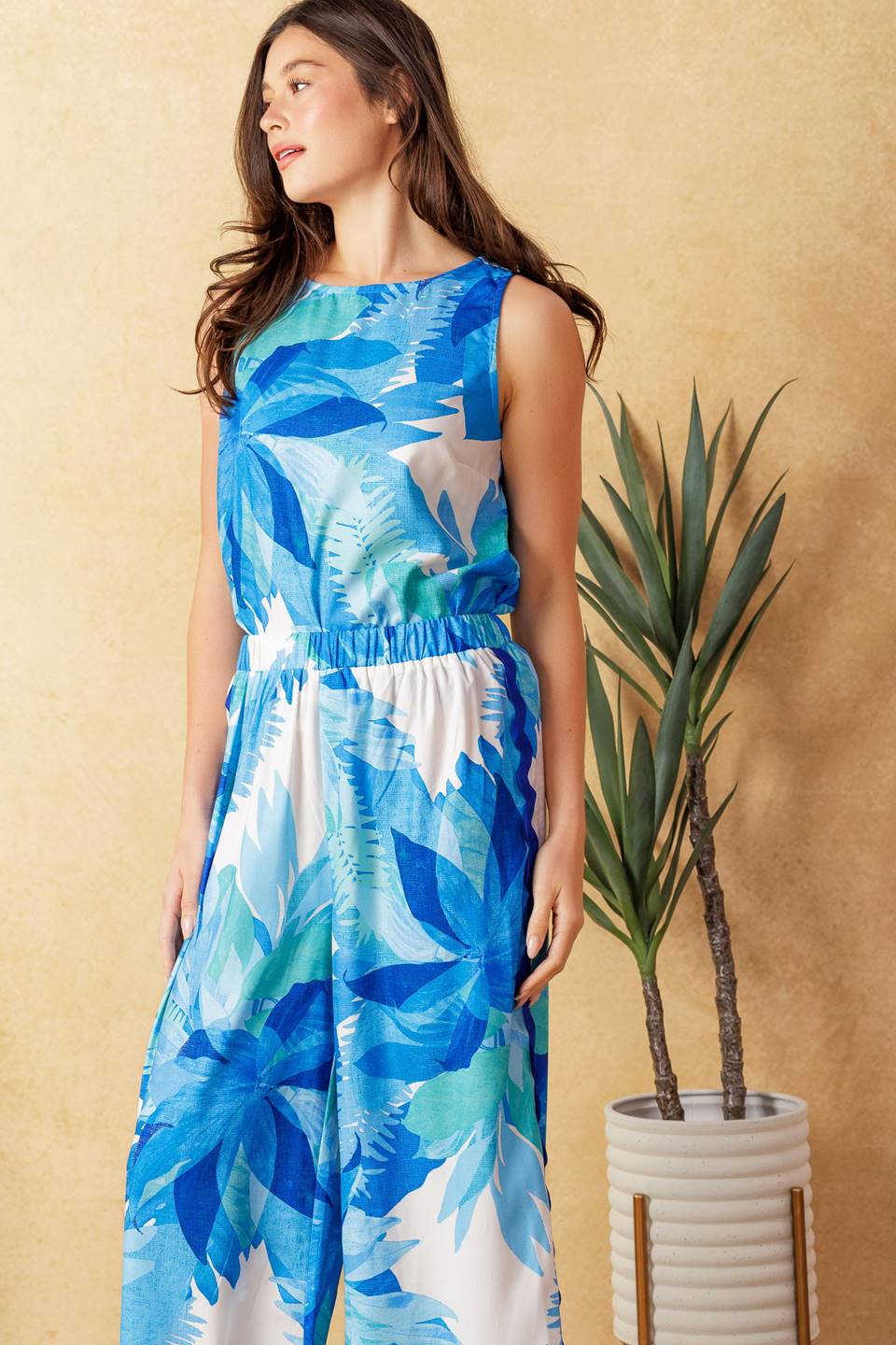 Calça de tecido estampado com cós elástico e detalhe de fita ric rac na lateral. Blusa combinando. Blusa de tecido com tratamento especial.