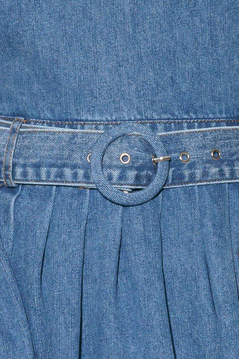 Vestido midi em jeans lavado com decote canoa, sem mangas, cinto do mesmo tecido, saia ampla, bolsos laterais, costas nuas, alça ajustável e fechamento com botões nas costas.