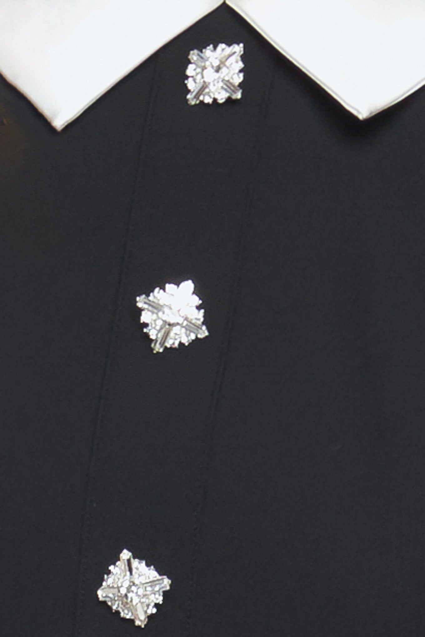 Vestido curto de tecido liso com gola, sem mangas, detalhe de botões na frente e fechamento em zíper nas costas. Apresenta gola, é sem mangas, tem botões frontais e fechamento em zíper nas costas.