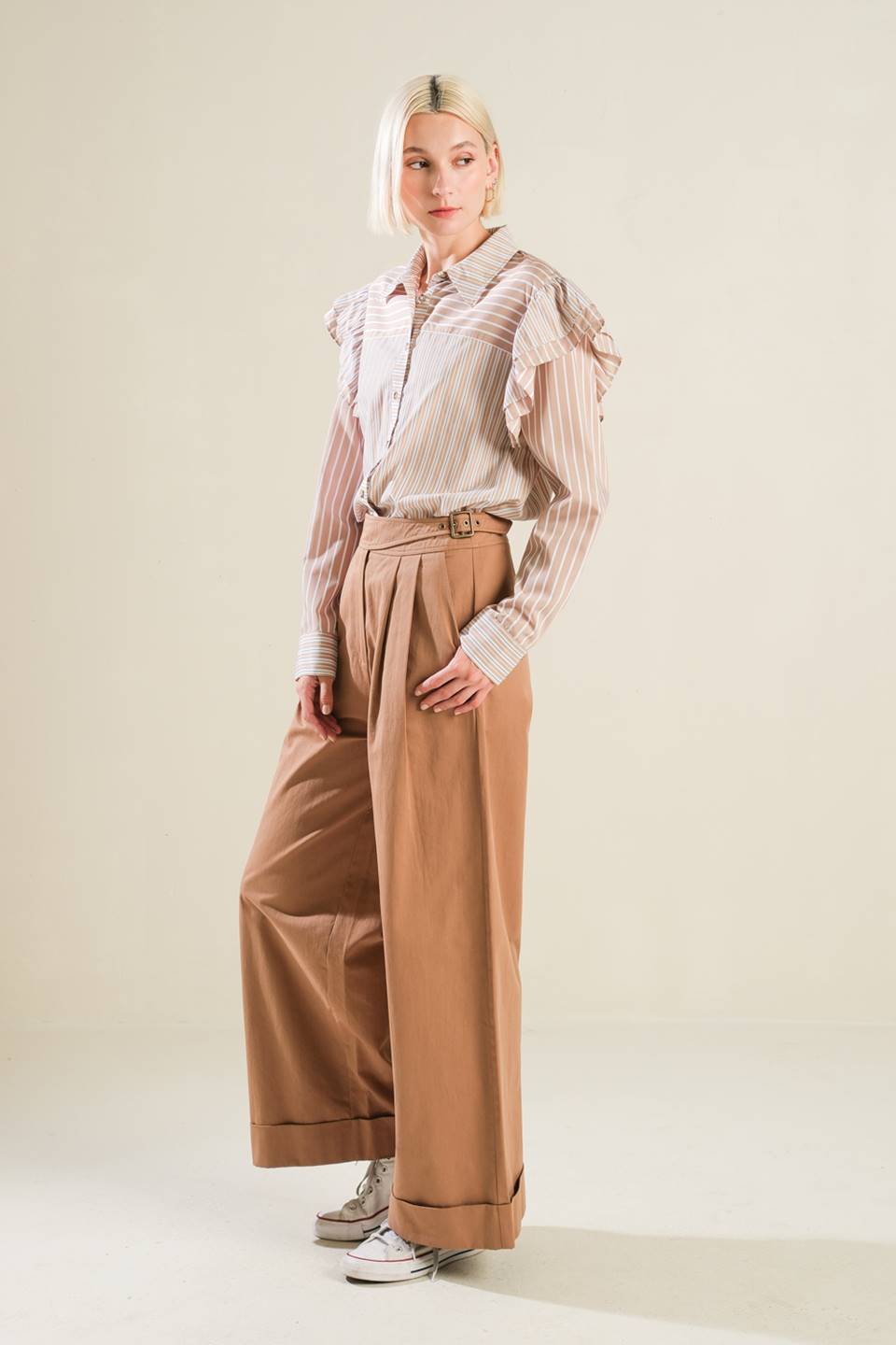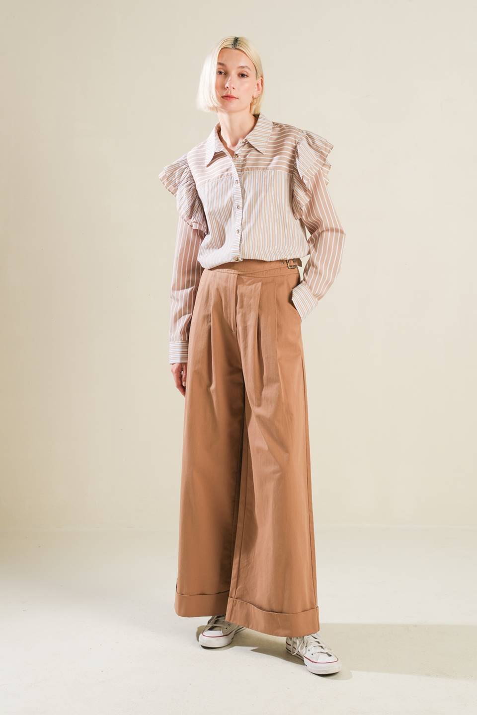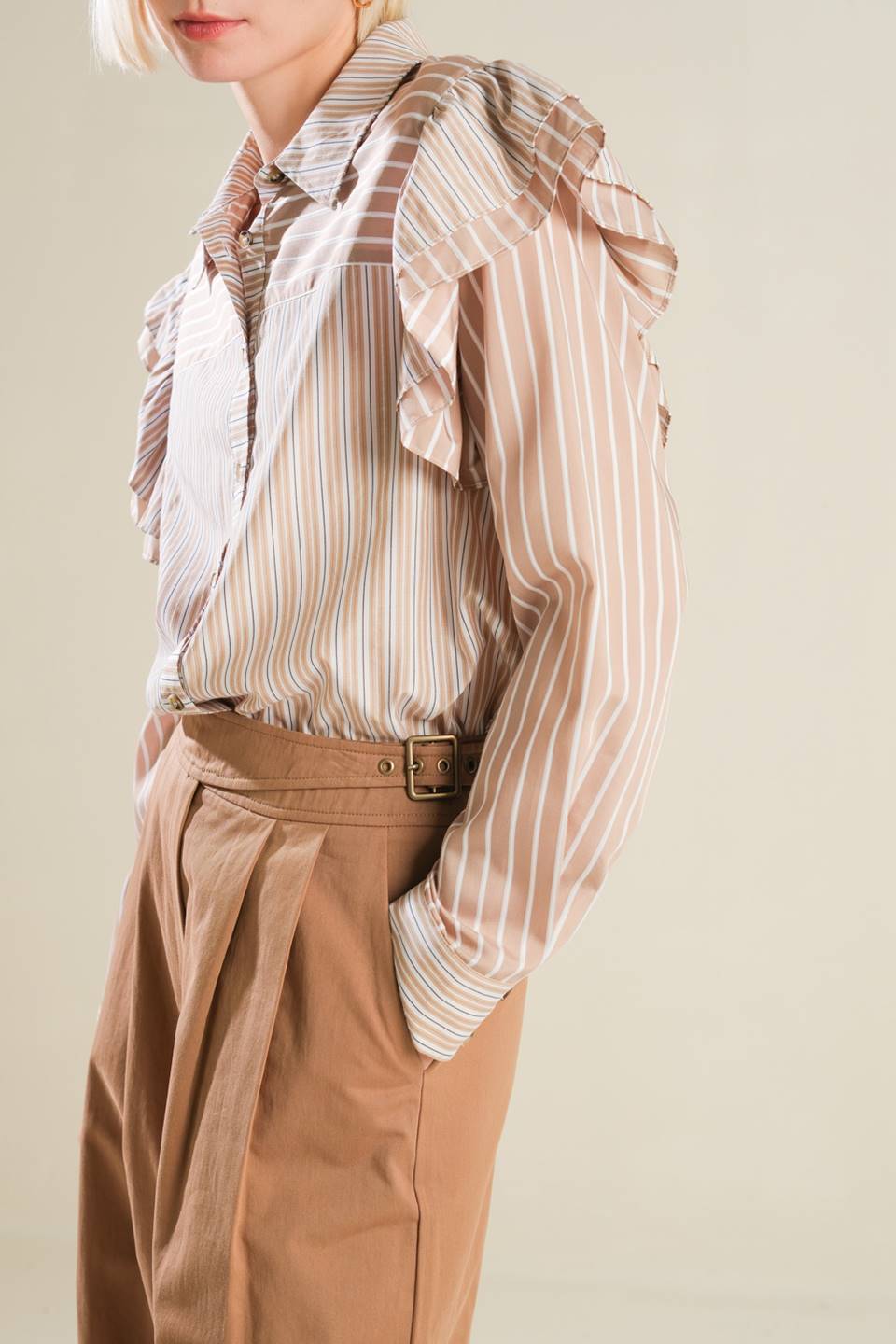 Blusa listrada em tecido plano com gola de camisa, fechamento frontal com botões, babado no ombro e mangas compridas.