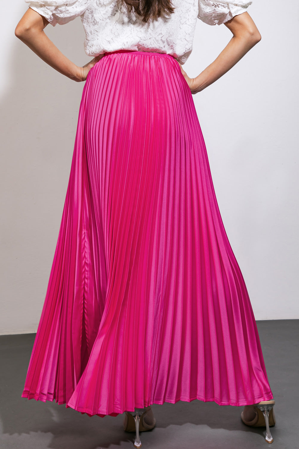 Saia midi de tecido liso com cintura elástica e pregas em toda a peça.
