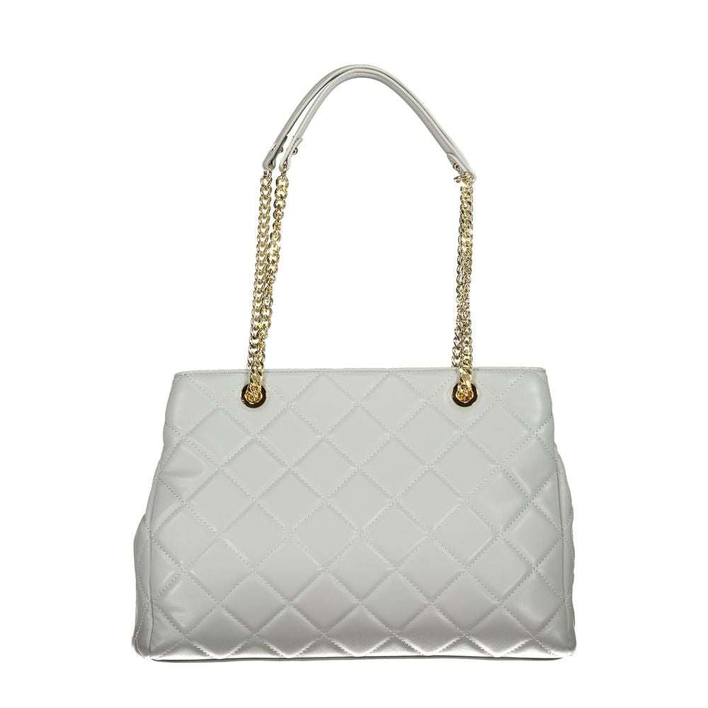 Bolsa de ombro com duas alças e corrente, dois compartimentos, um bolso interno central, um bolso interno, compartimentos internos para celular, fechamento em zíper, detalhes contrastantes e logotipo.