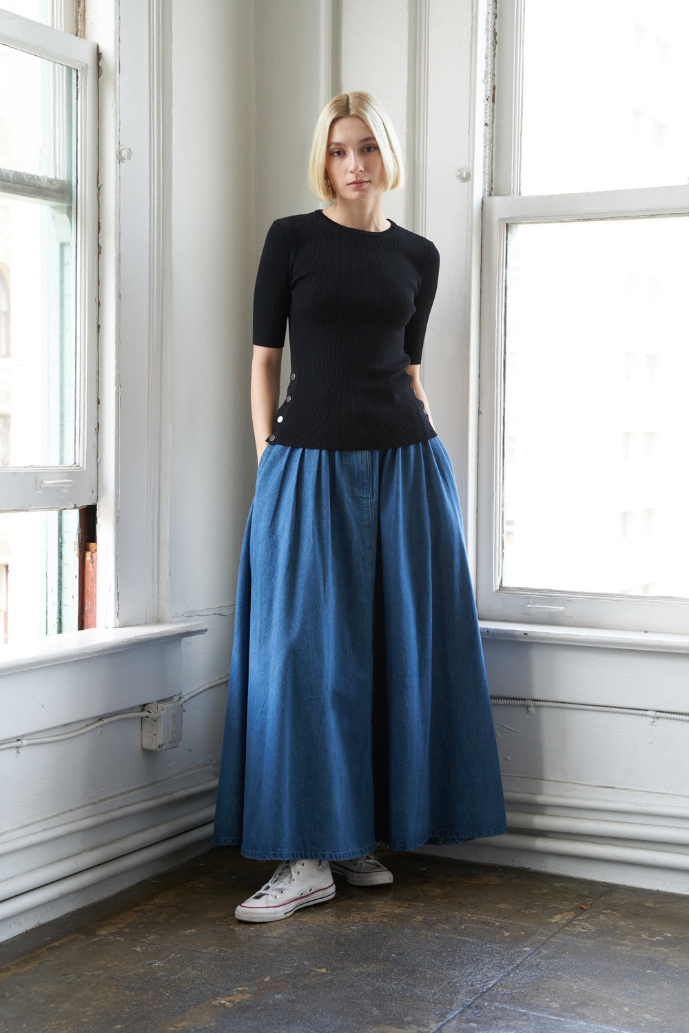 Suéter de malha canelada com gola redonda, mangas bufantes e detalhe de botão de pressão na parte inferior.