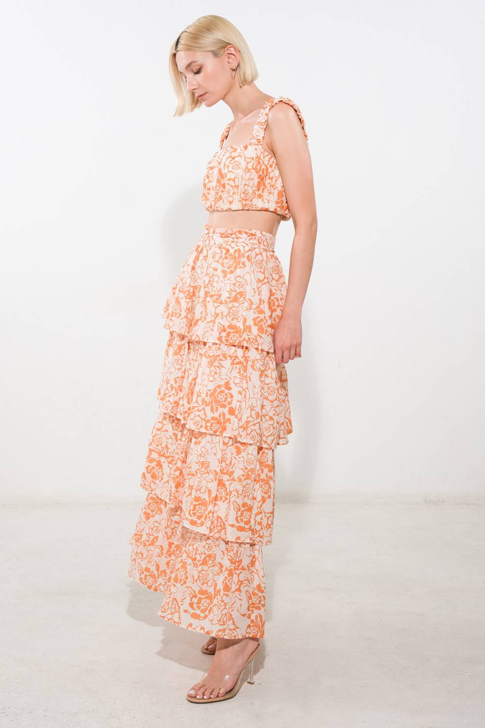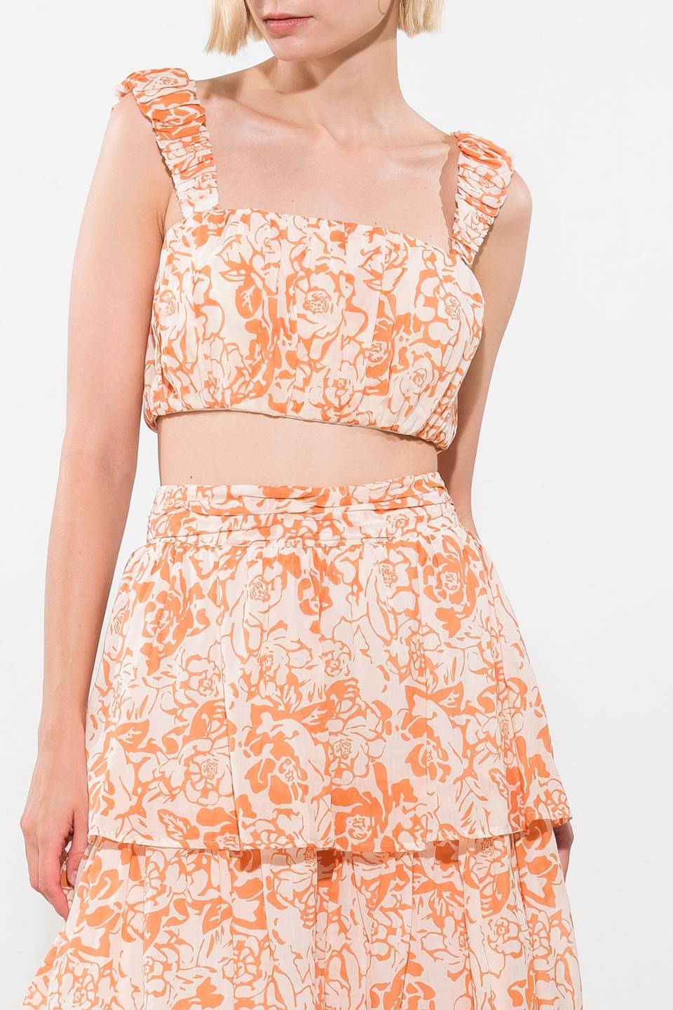 Blusa estampada em tecido plano com decote quadrado, mangas franzidas e fechamento por botões nas costas. Saia combinando FK1077.